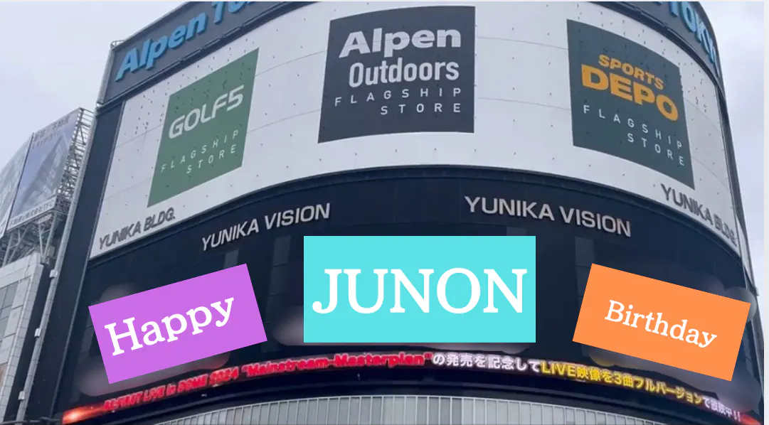 この写真のような、街中にある大きなビジョンで、JUNONくんのビジュアルを使用したカッコイイ映像を放映し、お誕生日をお祝いします!