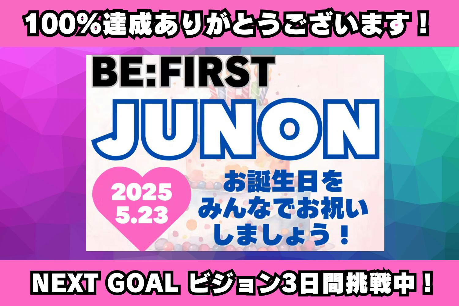 こんにちは!BE:FIRST JUNON 誕生日企画のHARUKAです!2/1にスタートした本プロジェクトは、1週間を残し100%を達成することができました!沢山のご参加、応援メッセージ、情報のシェアをいただき、改めて感謝とお礼を申し上げます。あわせて、大型ビジョンの放映日数をもっと延ばしてほしい!というお声を沢山いただいております。現在大型ビジョンの放映はお誕生日当日の【1日】となっていますが、この日に見に来ることができない方もいらっしゃると思います。また、より沢山の方に放映を見ていただき、JUNONくんのことをもっともっと知っていただきたいと考えています。これまでは「実施できるかわからないプロジェクトに参加するのは…」というお気持ちの方もいらっしゃったかもしれません。そのような方にも安心してご参加いただければと思います。2日、3日…できることなら1週間放映に向けて、ぜひご協力をよろしくお願いします。なお、下記にSNS用の紹介文をご用意いたしました。皆様の「参加しました!」のポストは、私たちのお知らせよりもはるかに多くの方の心に届きます。可能でしたら、ぜひご自身のSNSなどでシェアしていただけますと幸いです。【紹介文】※自由に書き直してくださいBE:FIRST JUNONくんの27歳のお誕生日にバス停広告と大型化ビジョンをみんなで贈る♡Happy J Funding♡現在100%を達成し【大型ビジョン3日間放映】のネクストゴールを目指しています!もっともっとJUNONくんのことを沢山の方に見て欲しい!ご参加をお待ちしております!https://camp-fire.jp/projects/815960/view