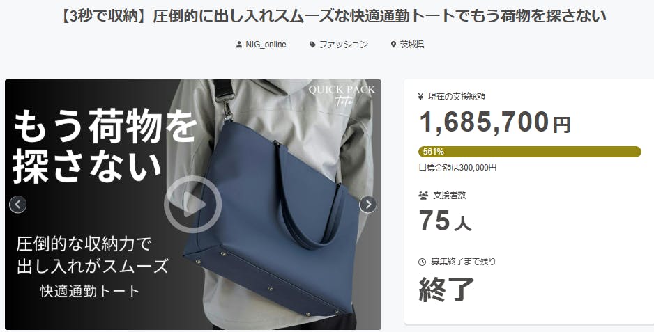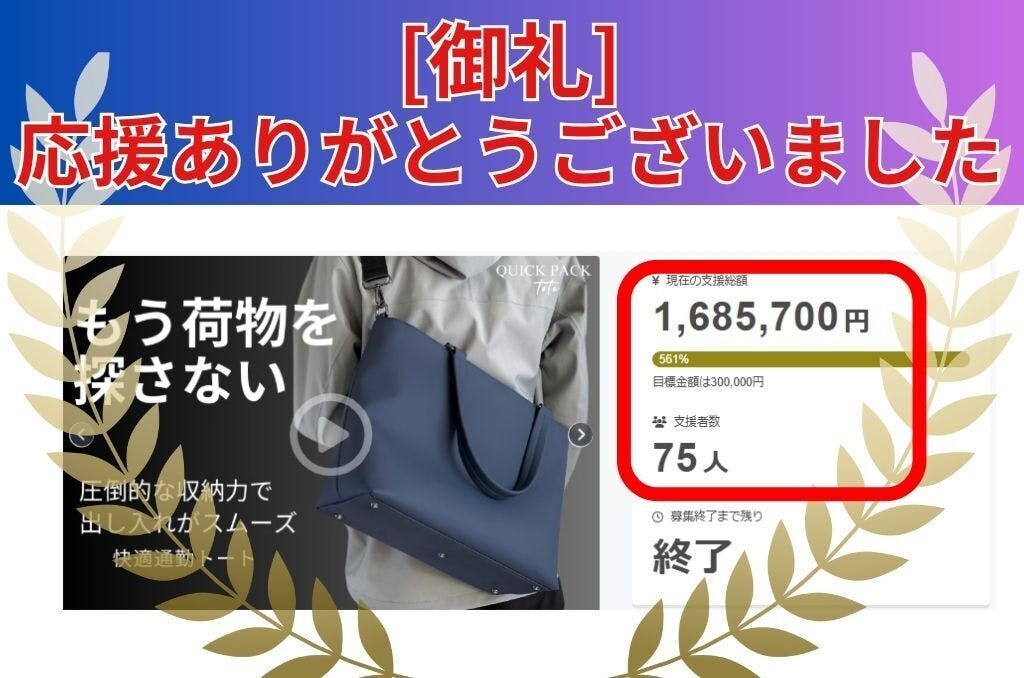 2025/05/24 12:00支援者のみなさまいつもプロジェクトの応援ありがとうございます。【出し入れスムーズな快適通勤トート】QUICK PACK toteプロジェクトが昨日をもって終了致しました。支援者総数:75名支援総額:1,685,7000円と、多くの方々からご支援を頂きました!たくさんのご支援いただけたこと、心より感謝申し上げます。本商品が、少しでも通勤や日常が”快適”になるようサポートできれば幸いです。お届けまで少々お時間を頂戴し恐縮ですが、引き続きどうぞよろしくお願いいたします。配送状況については随時活動報告にてご案内いたします。改めて本プロジェクトのご支援、サポート本当にありがとうございました。--------------------------------LINEで保証登録をしておくとお問い合わせやアフターサポートがスムーズに行えます。こちらのURLよりご登録ください。https://nigonline.com/qtote-mk-support-------------------------------- もっと見る
