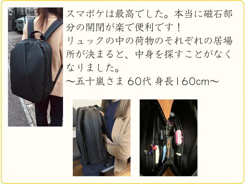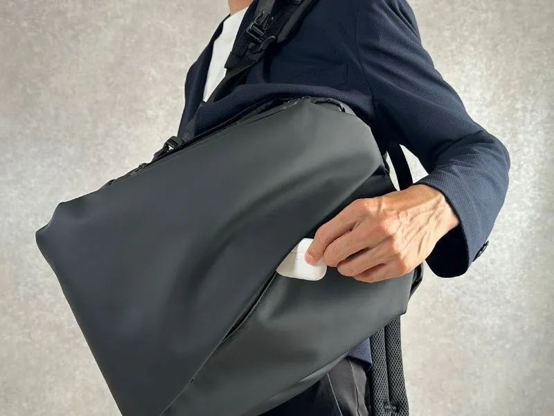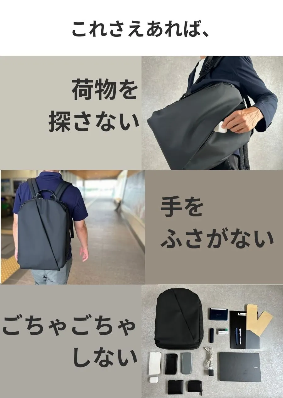 通勤、出張で移動が多い、パソコンをよく持ち歩く、スマホの出し入れが手間で嫌、荷物が取り出しにくいことにストレスを感じる、バッグをいちいち降ろさず荷物の出し入れがしたい、そんな方におすすめです。