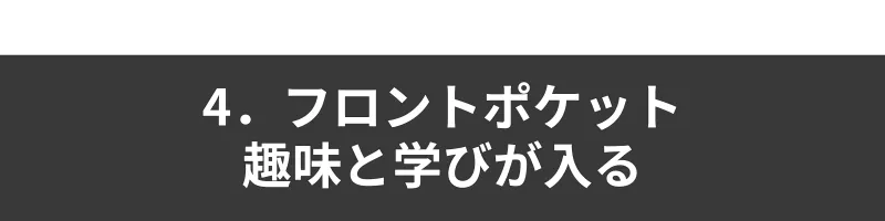 そんなすきま時間を有意義にするためのアイテムは、アクセスしやすく出し入れしやすいフロントポケットに。