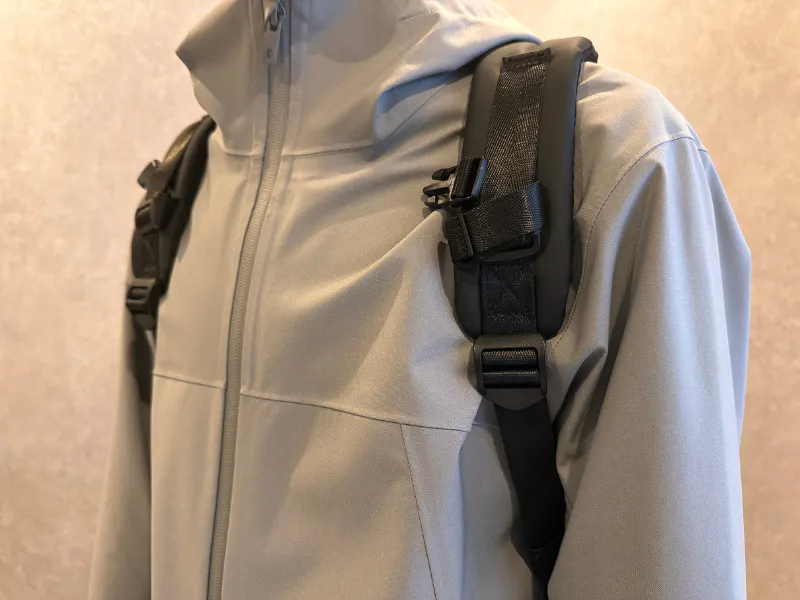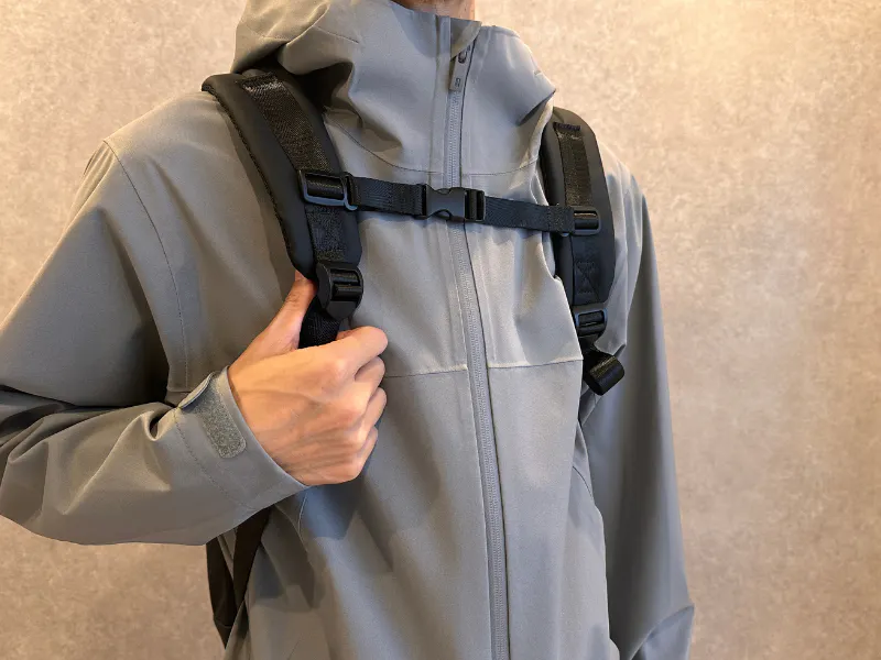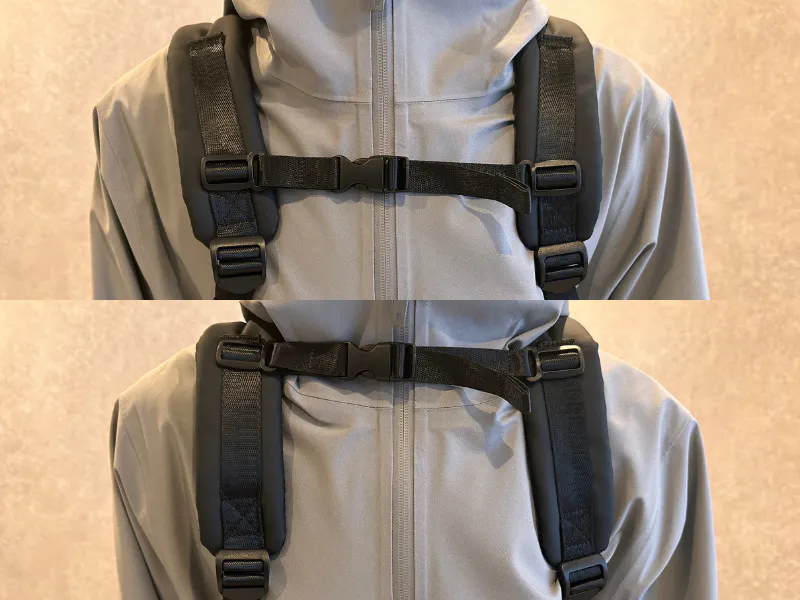リュックを背負ったまま動き回れるように、可動式のチェストベルトを採用しました。