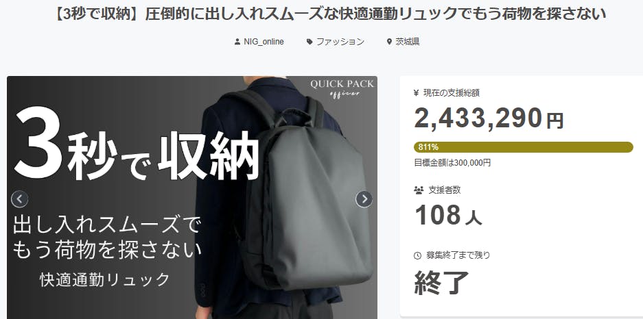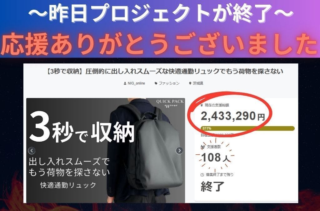 2025/05/10 18:00支援者のみなさまいつもプロジェクトの応援ありがとうございます。《出し入れスムーズな快適通勤リュック【QUICK PACK officer】》プロジェクトが、昨日をもちまして終了しました。サポーター:108名応援購入総額:2,433,290円温かいコメントもたくさん送って頂き、心より御礼申し上げます。本当にありがとうございました。お届けまで少々お時間を頂きますが、一日でも早くお届けできるよう対応してまいります。なお、発送状況につきましては随時活動レポートで報告させていただきます。※お届け予定時期までにお引越し等のご予定がある場合はお届け先の設定にご注意ください。引き続き快適さを追求し、より良い商品を作ってまいります。たくさんの応援、本当にありがとうございました!!!--------------------------------LINEで保証登録をしておくとお問い合わせやアフターサポートがスムーズに行えます。こちらのURLよりご登録ください。https://nigonline.com/officer-mk-support-------------------------------- もっと見る