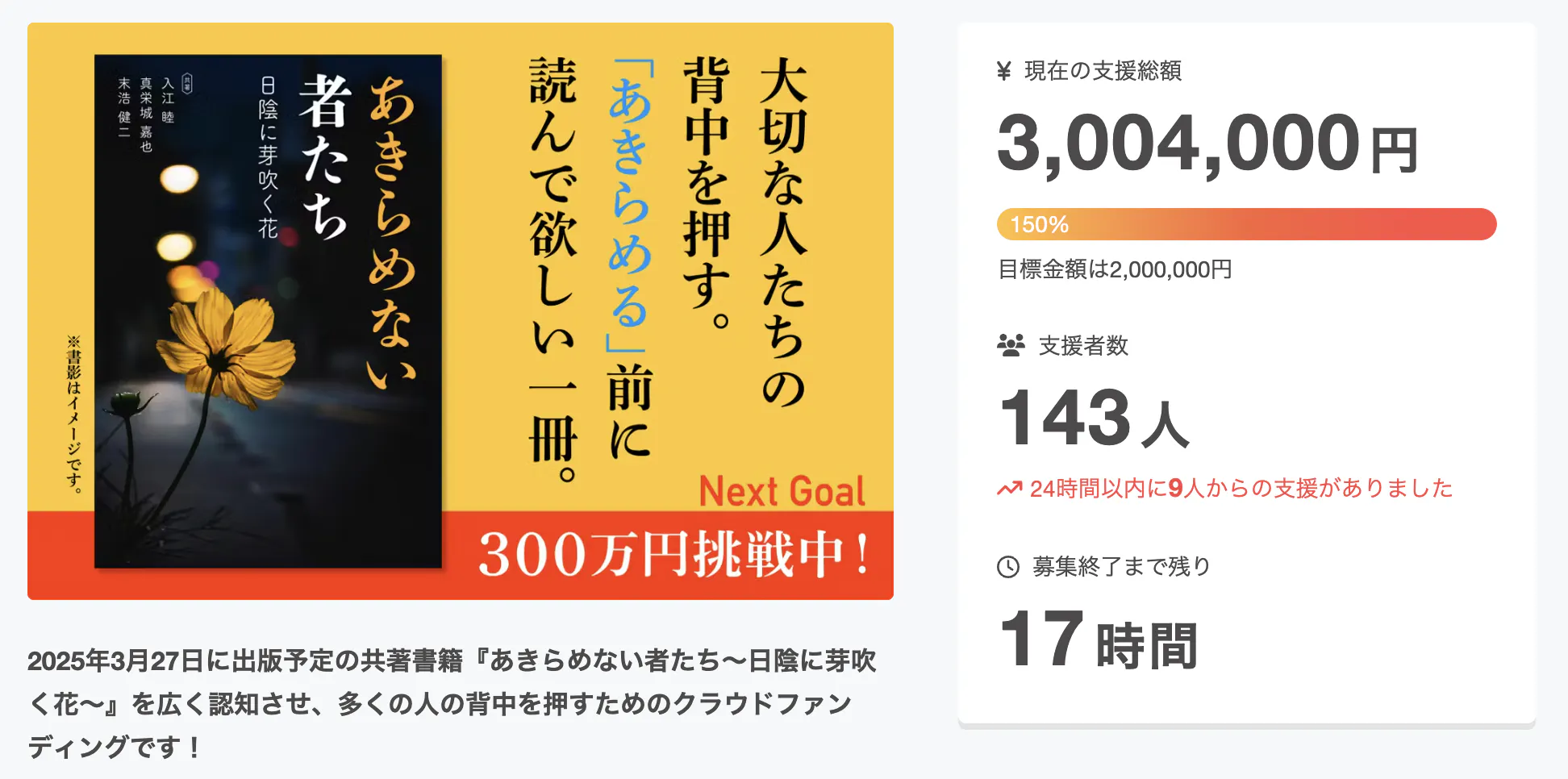 2025/01/31 06:39ついに!皆さまからの熱い応援とご支援のおかげさまでNextGoal 300万円を達成いたしました!!!本当に本当にありがとうございます。ただただ感謝しかございません。一歩踏み出す勇気を持つきっかけとなる本『あきらめない者たち〜日陰に芽吹く花〜』の背中を押していただいたご恩に報いるために、一生懸命に取り組んで参ります!本日1/31 23:59のプロジェクト終了まで全力で駆け抜けます!!! もっと見る