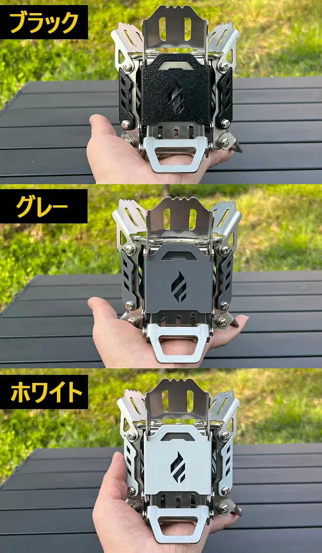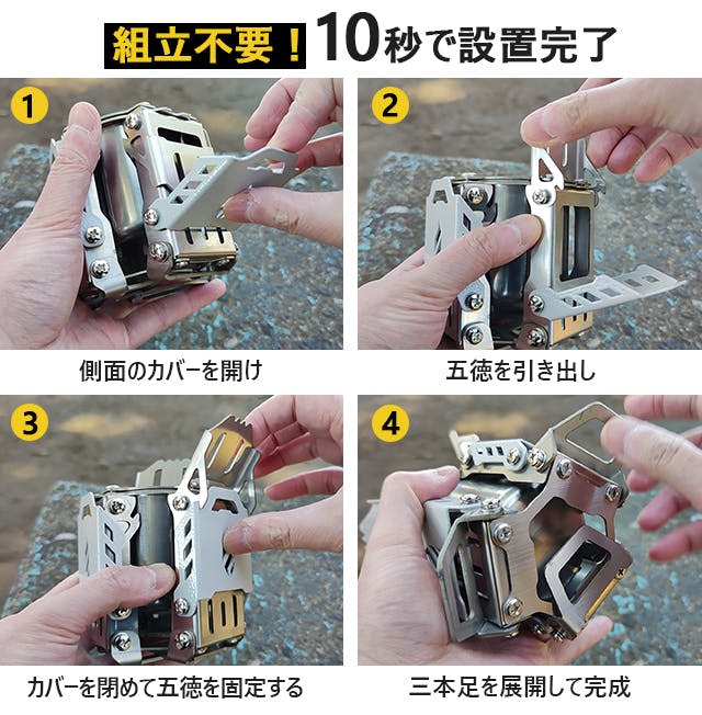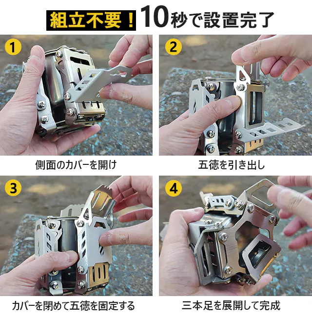 A:一体型で組み立てが不要な構造になっております。折り畳み式で展開可能な固定脚や五徳付きの構造を採用し、持ち運ぶ時もスペースをとりません。