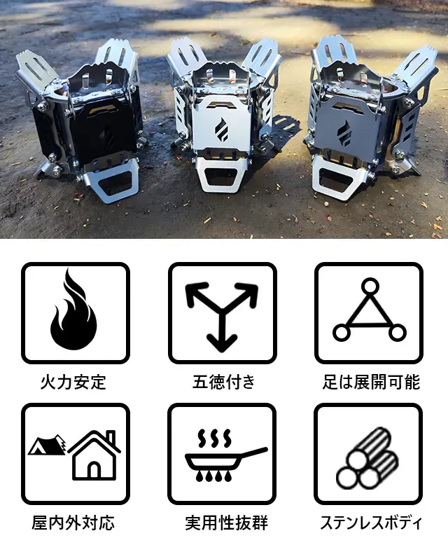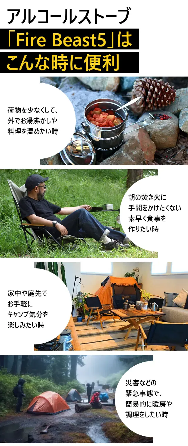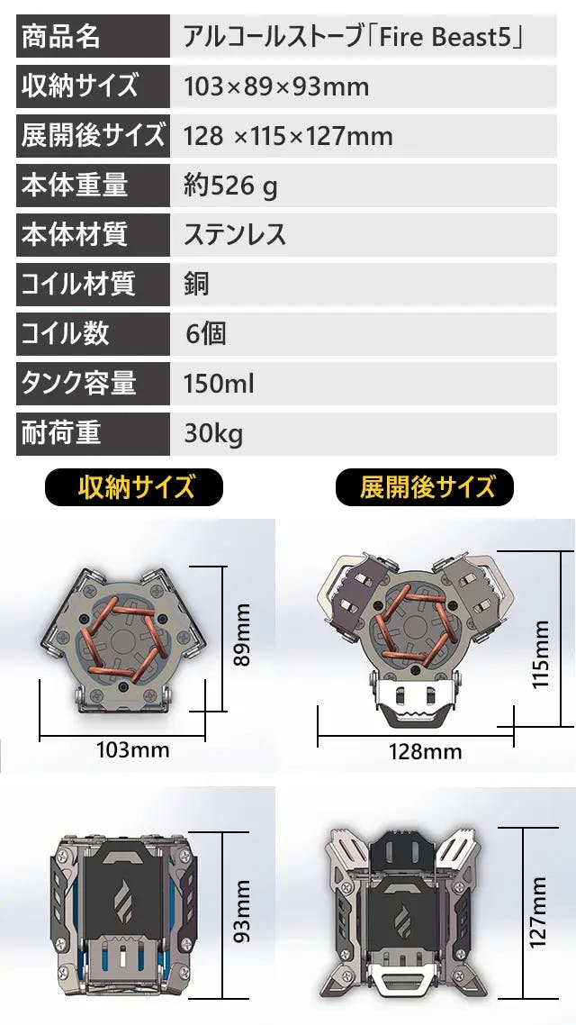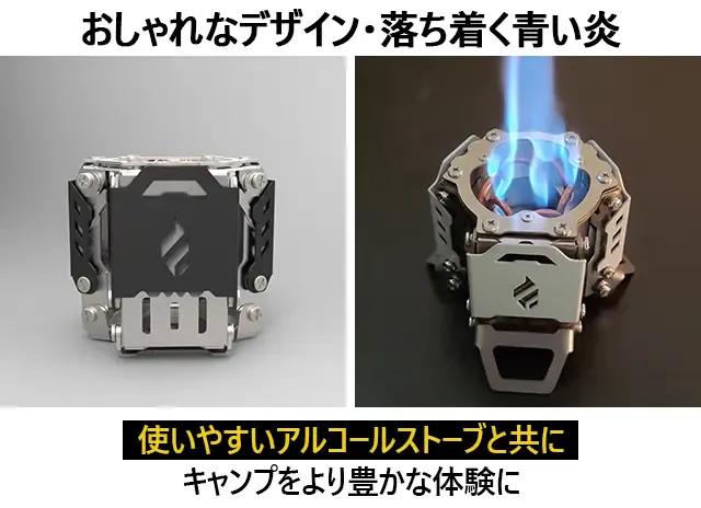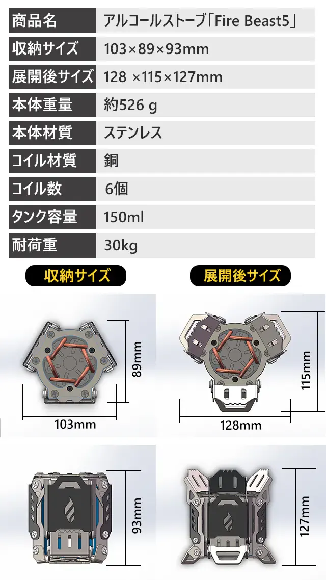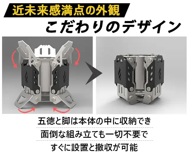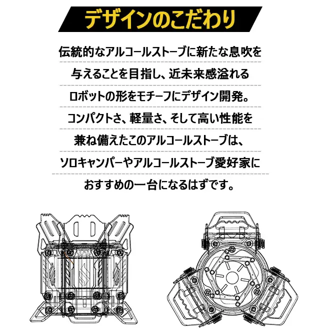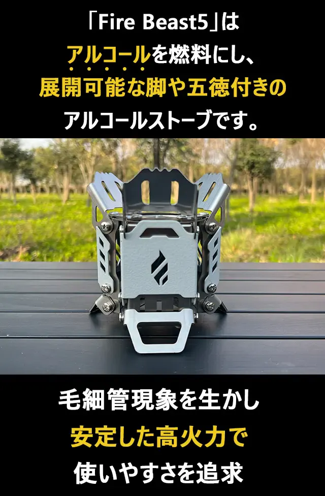 市販のアルコールストーブと一線を画す「Fire Beast5」は、近未来感満点の外観を持ち、低燃費で扱いやすく、足や五徳が本体に収納可能で実用性とコンパクト性、そしてデザイン性を向上させた商品です。