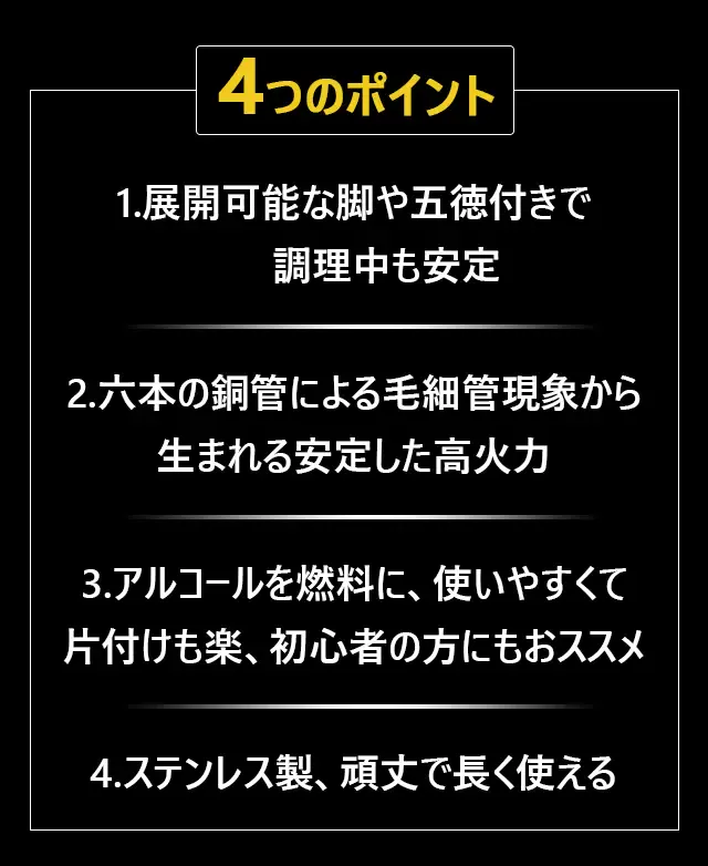 燃料のアルコールは、揮発性が高く気化しやすいため、ブレのない火力を実現することが出来るのです。