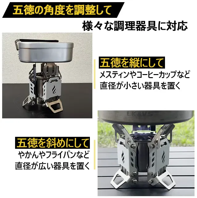 いろんな調理器具を使えるように想定してデザインしたため、五徳の角度を調整することが出来ます。