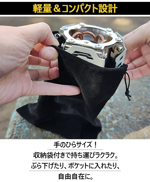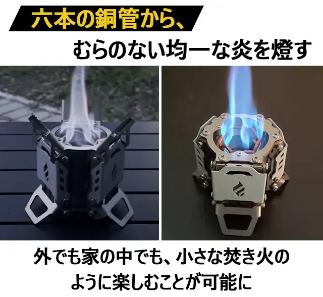 毛細管現象を利用して、六本の銅管から生まれた安定した高火力で調理や暖もとれます。キャンプをより一層、楽しい空間にしてくれることでしょう。