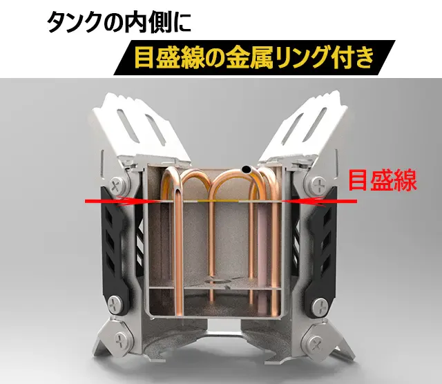 タンク内には燃料目盛線としての金属リング付きで、多量にアルコールを注ぐ心配がありません。