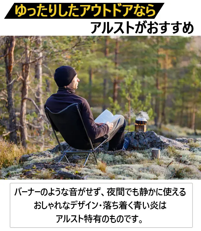 本体のタンクにアルコールを注ぐだけで直接火をつけられるため、操作が簡単でキャンプ初心者にもおすすめです。