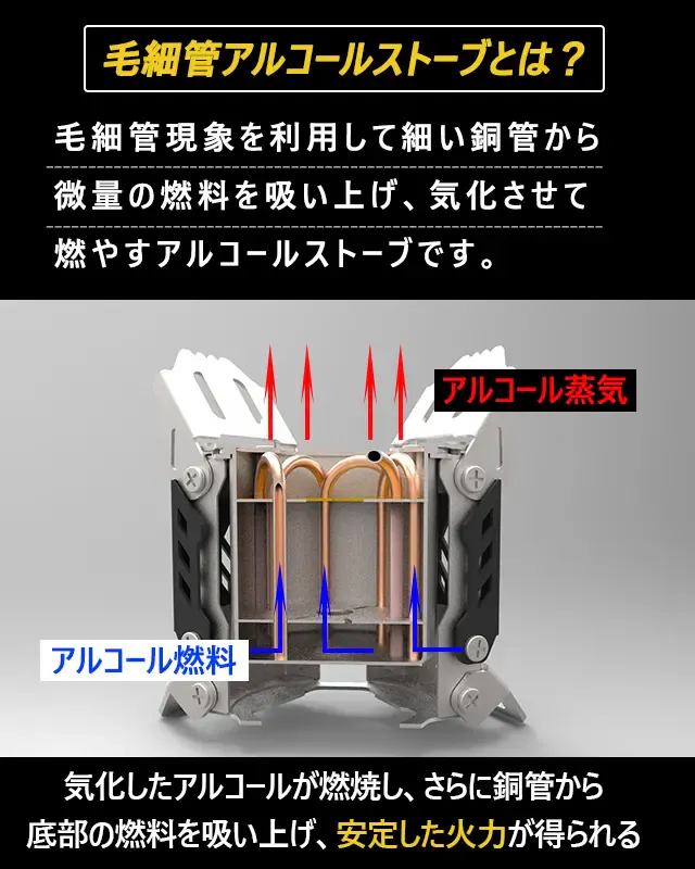 銅管の中では毛細管現象によりアルコールを吸い上げ、熱してから気化までが早く、また燃料の量には左右されません。