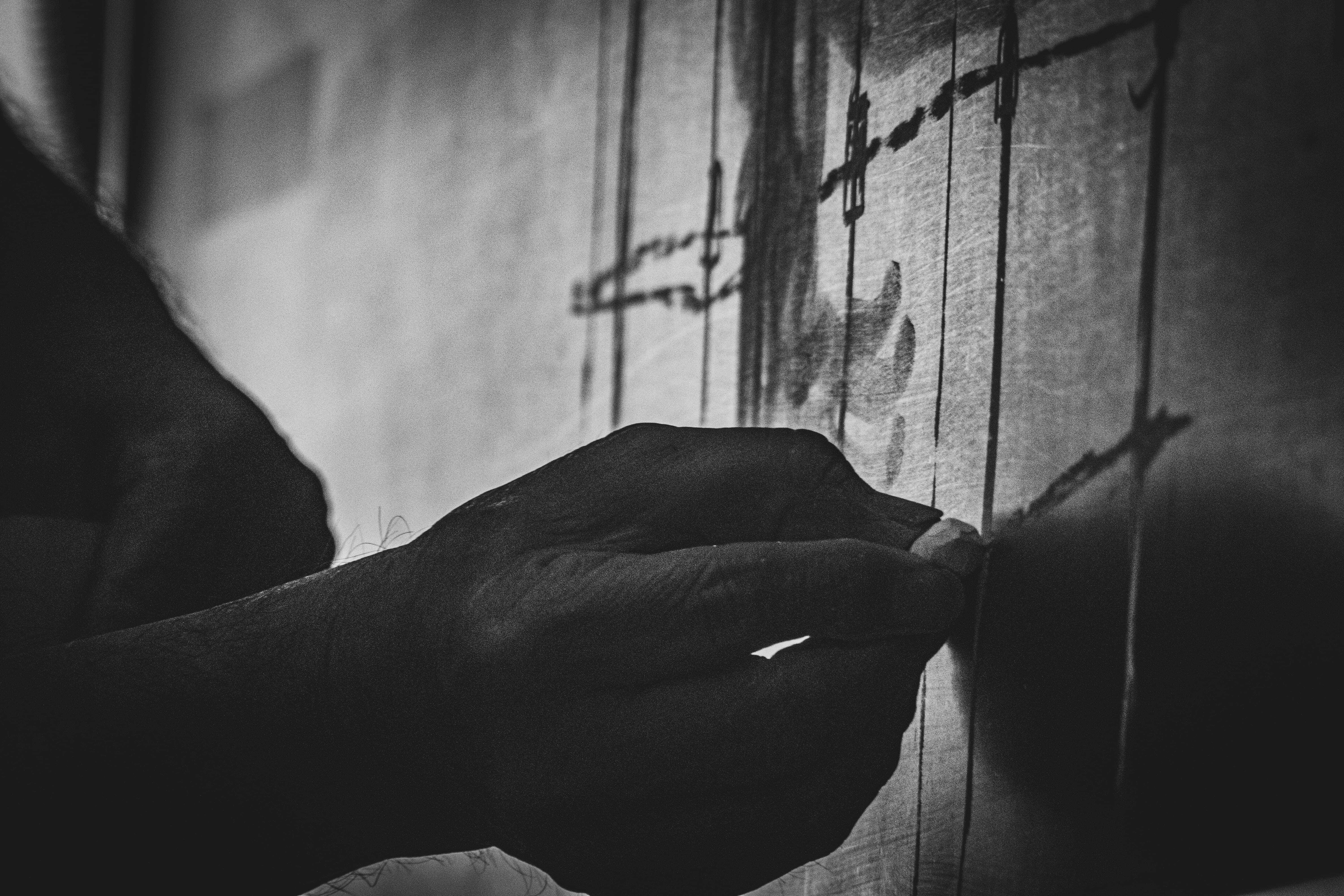 先生の手は大きくて強い。メモの字も赤青鉛筆で大きく太い。道具をよく触り、黒板をバンバン叩いて音を立て、線を引く。その“手の振る舞い”が講義そのものを語っているから、カメラもそこに寄っていきました。チョークがボキボキ折れるほど力が入る瞬間もあるし、黒板消しでは簡単に消えない痕跡が残る。そうした物質性は、写真で寄らないと掴めない。写真だからこその表現だと思いました。