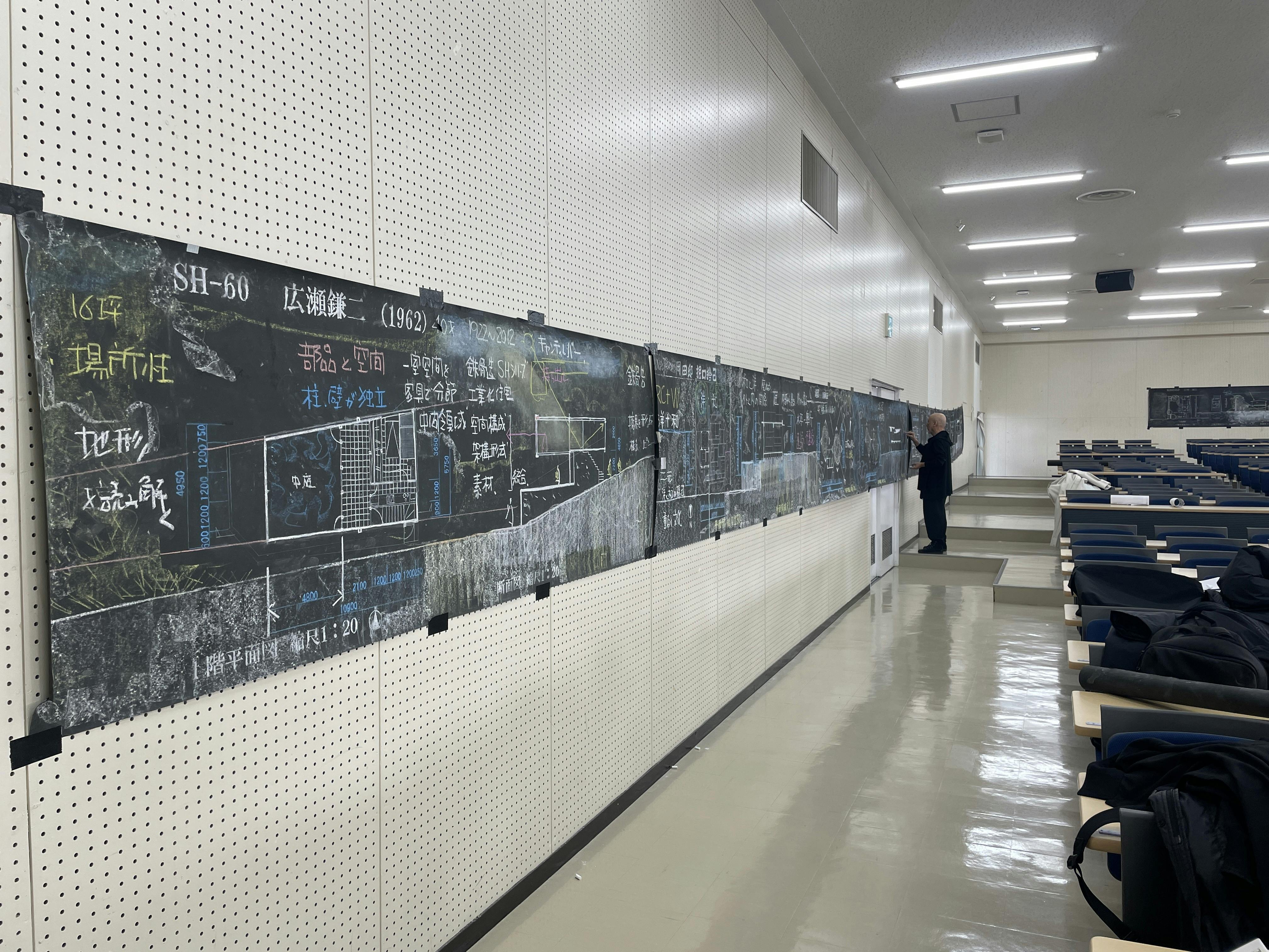 大教室の壁面に張って書き足しながら撮影