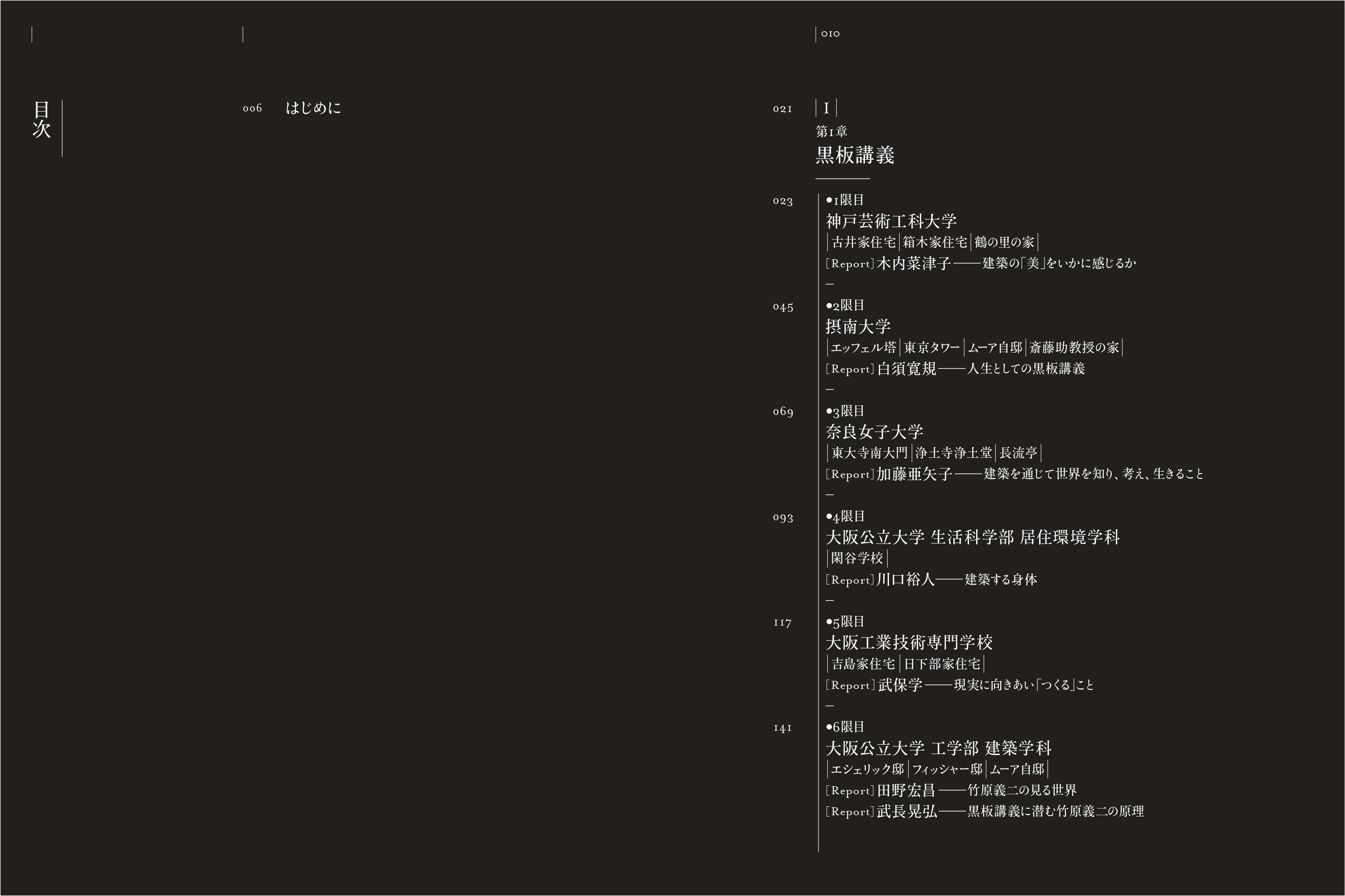 時代やビルディングタイプを横断して講義がされています。奈良女子大学では奈良の建築をいくつか取り上げ、また大阪公立大学生活科学部では、黒板講義の原点とも言える閑谷学校だけが取り上げられています。