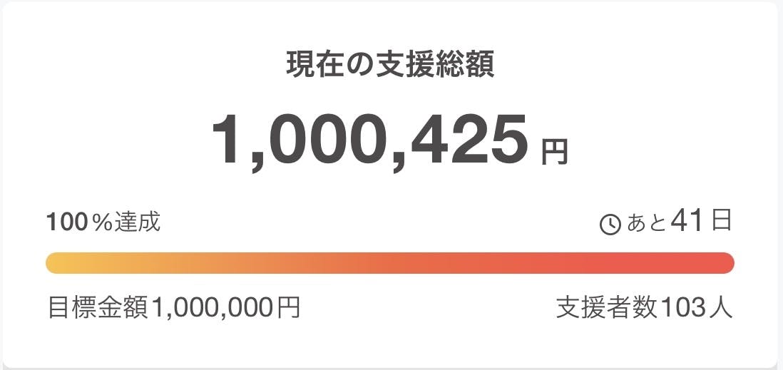 皆さまの温かいご支援のお陰で、プロジェクト終了予定日まで41日を残し、目標額の100万円を達成することができました!