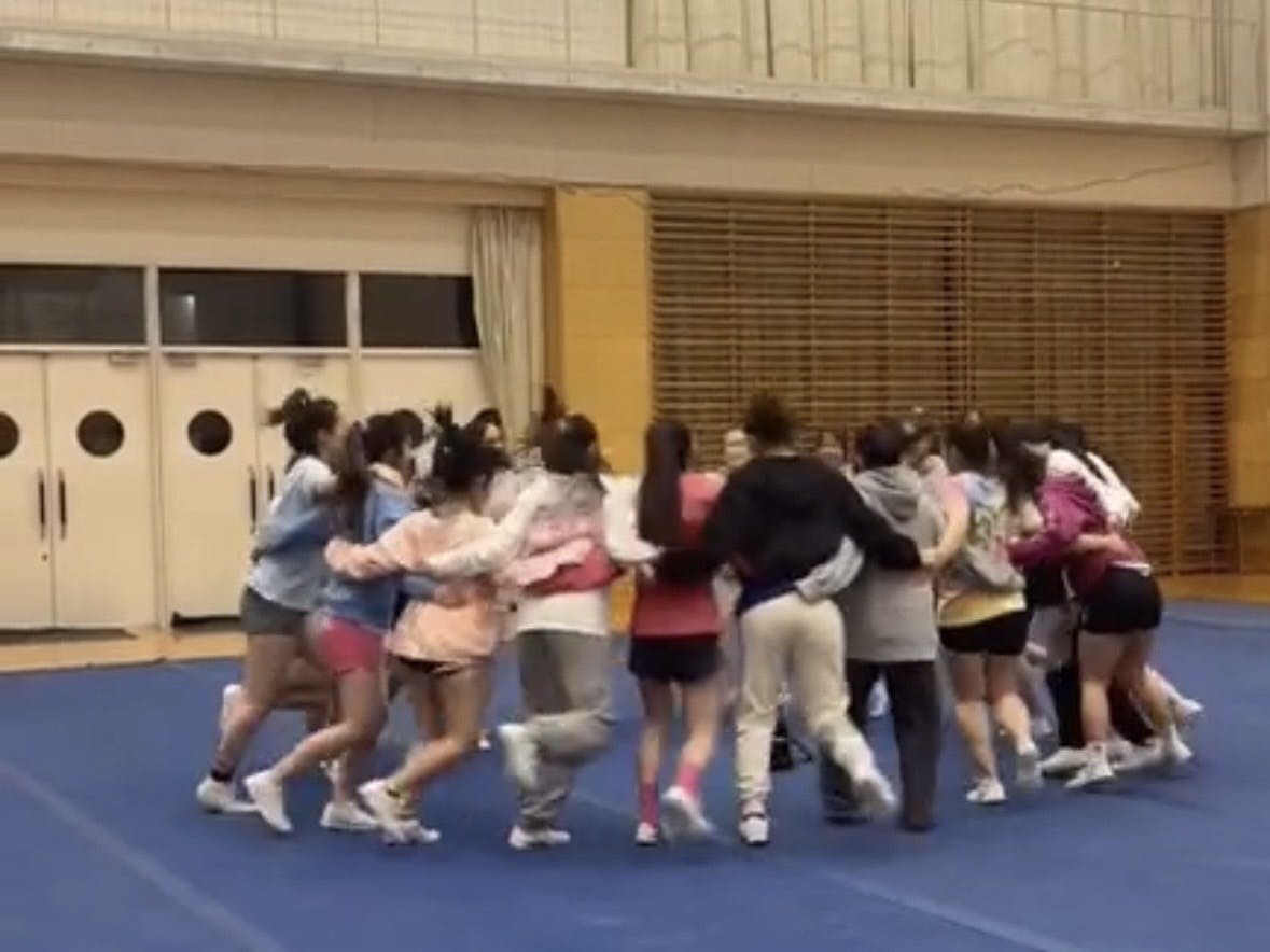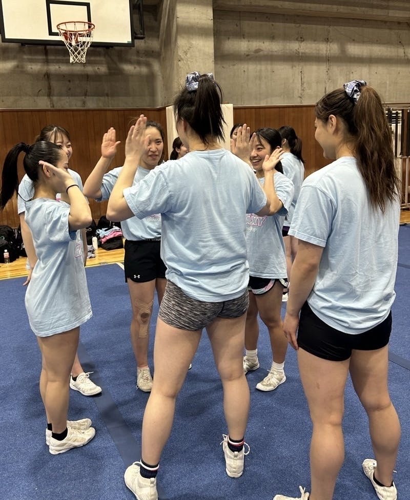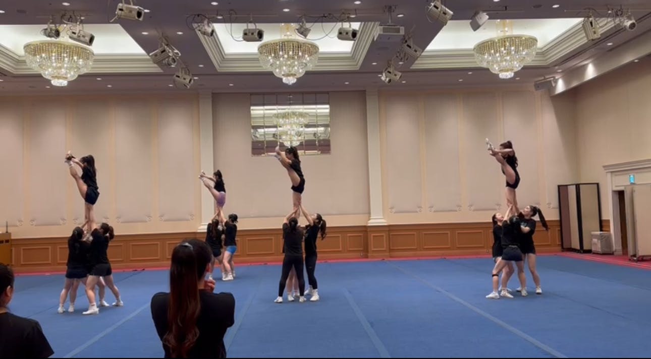 演技の序盤から順に、タンブリングを実施するメンバーや一緒にスタンツを組むメンバーで集まり、意識する事や決めている約束を再確認します。
