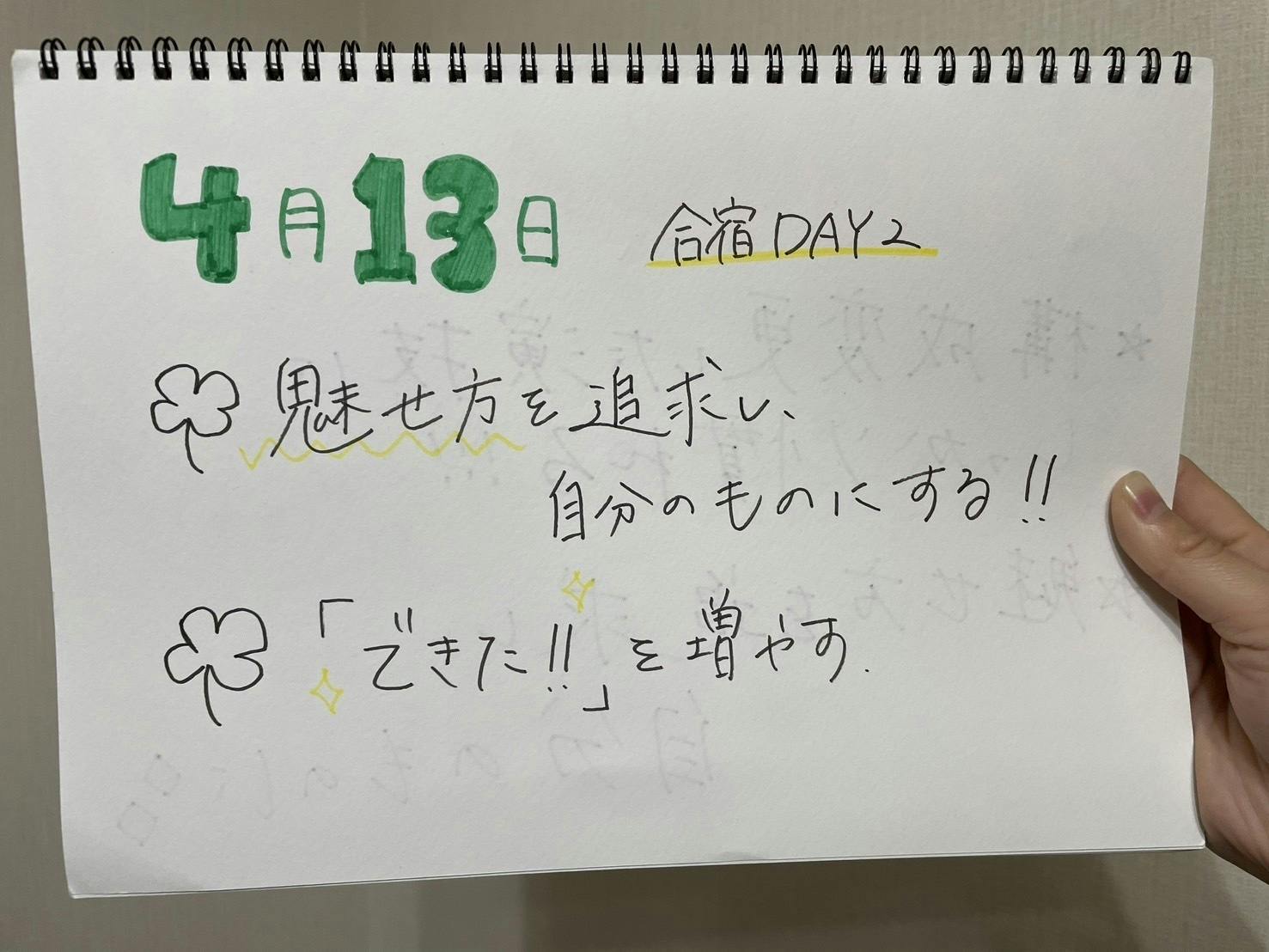 合宿2日目、1日目に引き続き「魅せ方を追求し自分のものにする」ことと、自信をつけるために必要な「できた!を増やす」ことを目標にしました!