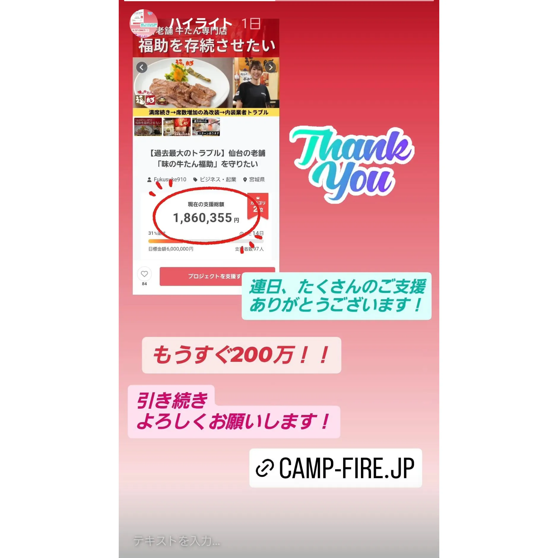 クラウドファンディングも残り2週間を切りとても焦っています。