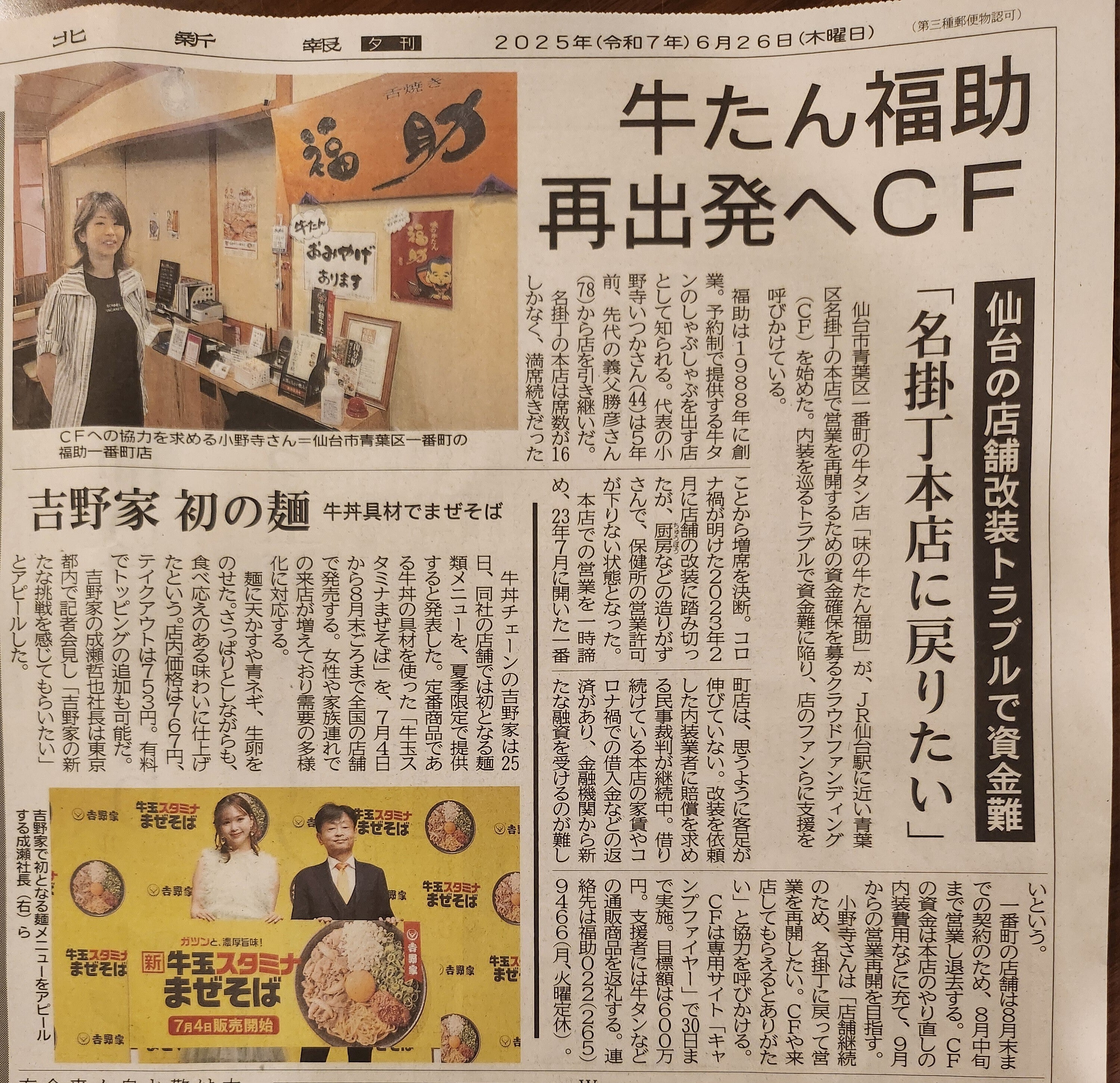 本日6月26日(木)河北新報(地方)の夕刊に記事掲載して頂きました。