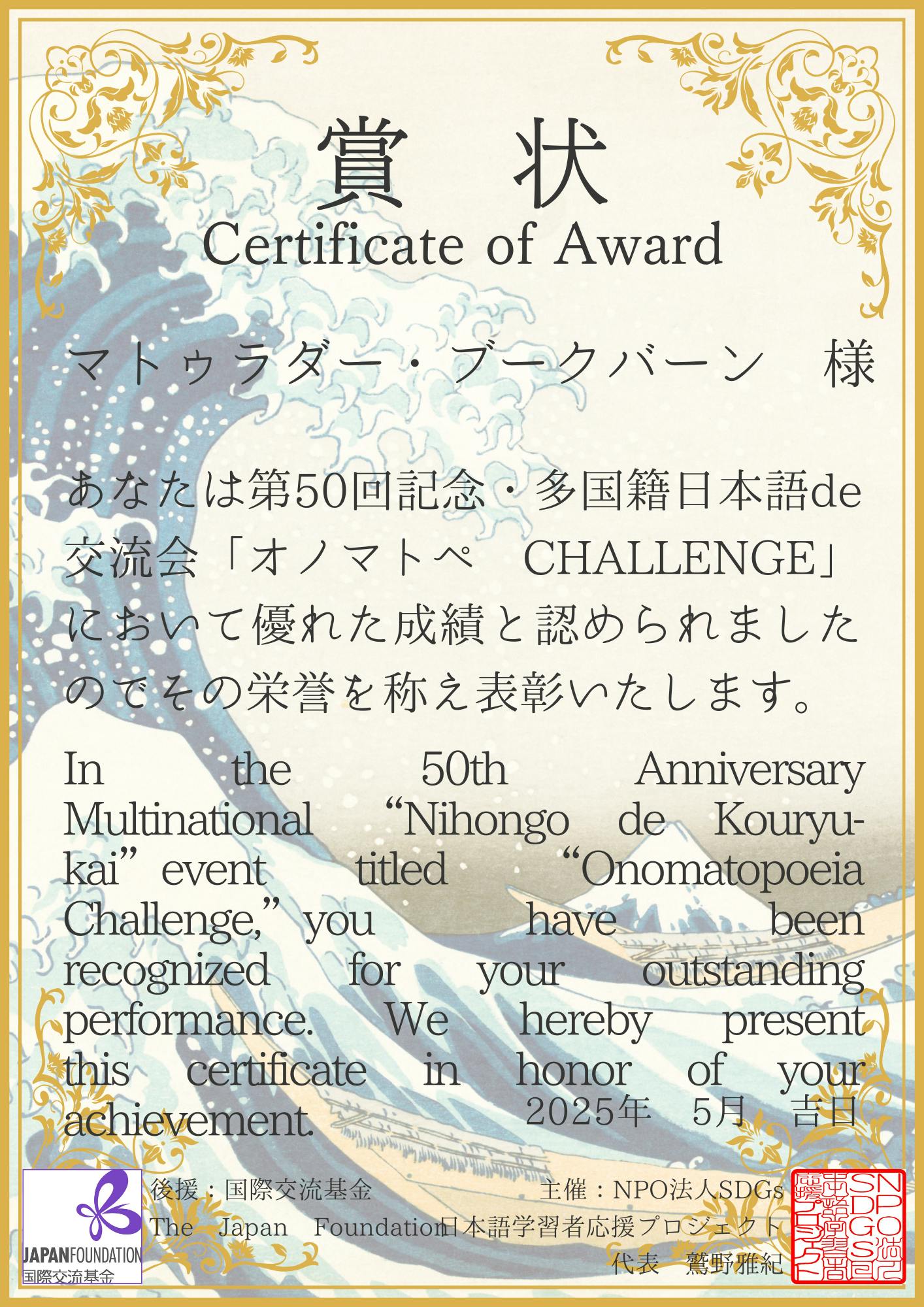2025/05/17 14:03このたびは、第50回記念・多国籍日本語de交流会「オノマトペ CHALLENGE」 にご支援いただき、誠にありがとうございました!皆さんの日本語表現に対する熱意と創造力に、運営チーム一同とても感動しました。みんなの作品も、ぜひご覧ください!今回の投稿動画をまとめたYouTubeの再生リストはこちらです:Onomatopedia – オノマトペ CHALLENGE再生リスト(あいうえお順)笑って、驚いて、学べる動画がたくさん揃っています。ぜひご覧いただき、お友達や日本語仲間にもシェアしてくださいね!あらためて、ご支援いただき本当にありがとうございました。心より感謝をこめてNPO法人SDGs日本語学習者応援プロジェクト代表 蒔野雅紀Check out our sister YouTube channel!No Way Japan! もっと見る
