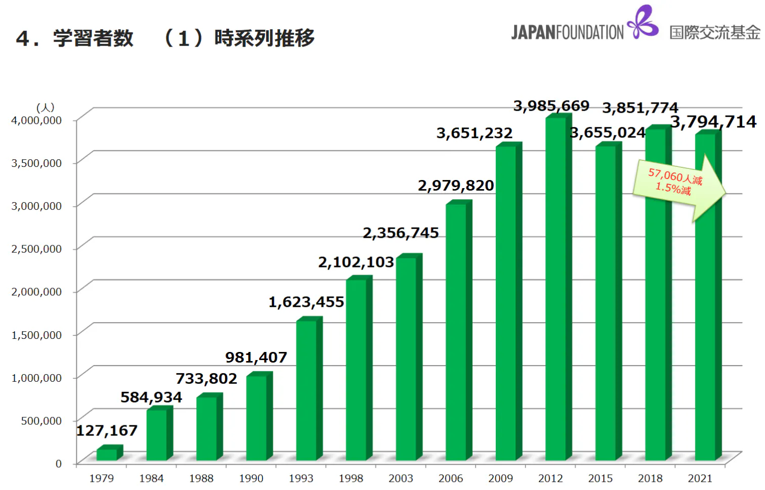 現在、世界の日本語学習者数は、約379万人います(2021年度調査より)。しかしこの数値は初中高等教育機関に在籍する"現役"の学生が対象のため、卒業したのちも独学で学び続ける学生やオンラインレッスンの学生も含めれば数倍はいると思われます。