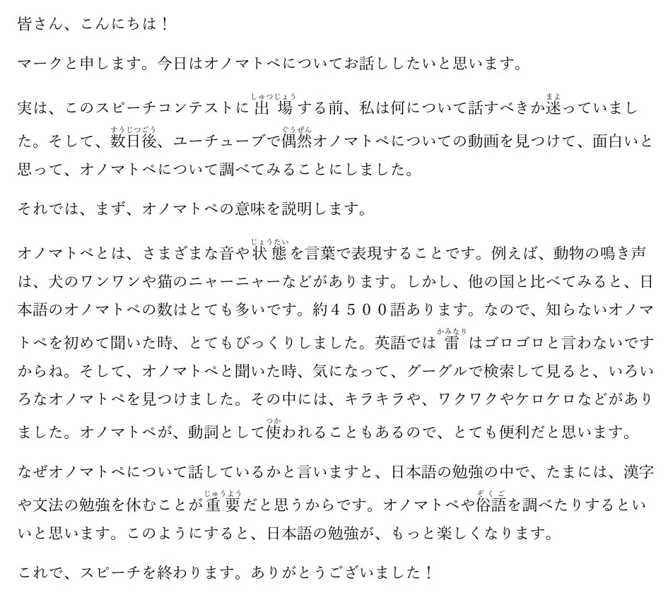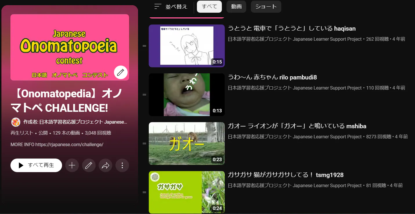 2025/05/17 14:03このたびは、第50回記念・多国籍日本語de交流会「オノマトペ CHALLENGE」 にご支援いただき、誠にありがとうございました!皆さんの日本語表現に対する熱意と創造力に、運営チーム一同とても感動しました。みんなの作品も、ぜひご覧ください!今回の投稿動画をまとめたYouTubeの再生リストはこちらです:Onomatopedia – オノマトペ CHALLENGE再生リスト(あいうえお順)笑って、驚いて、学べる動画がたくさん揃っています。ぜひご覧いただき、お友達や日本語仲間にもシェアしてくださいね!あらためて、ご支援いただき本当にありがとうございました。心より感謝をこめてNPO法人SDGs日本語学習者応援プロジェクト代表 蒔野雅紀Check out our sister YouTube channel!No Way Japan! もっと見る
