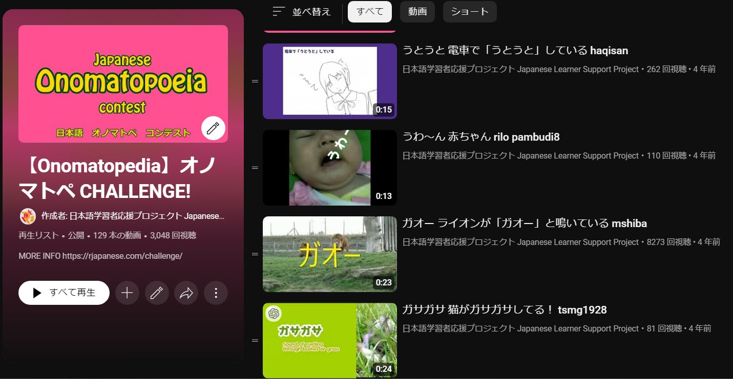 2025/05/17 14:03このたびは、第50回記念・多国籍日本語de交流会「オノマトペ CHALLENGE」 にご支援いただき、誠にありがとうございました!皆さんの日本語表現に対する熱意と創造力に、運営チーム一同とても感動しました。みんなの作品も、ぜひご覧ください!今回の投稿動画をまとめたYouTubeの再生リストはこちらです:Onomatopedia – オノマトペ CHALLENGE再生リスト(あいうえお順)笑って、驚いて、学べる動画がたくさん揃っています。ぜひご覧いただき、お友達や日本語仲間にもシェアしてくださいね!あらためて、ご支援いただき本当にありがとうございました。心より感謝をこめてNPO法人SDGs日本語学習者応援プロジェクト代表 蒔野雅紀Check out our sister YouTube channel!No Way Japan! もっと見る