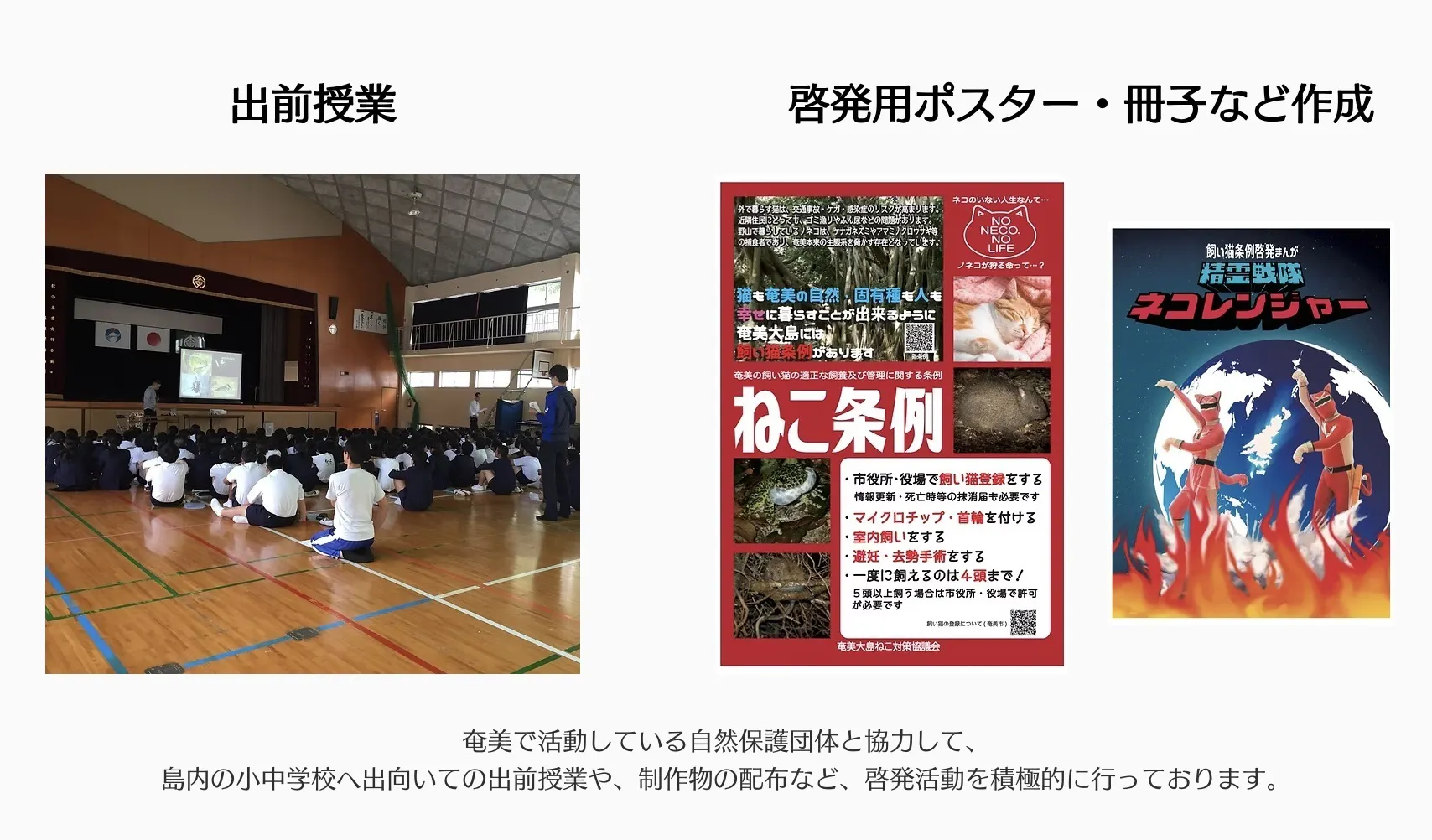 「まずは正しい飼い方を知ってもらおう」と、チラシを配って啓発を始めた矢先――自然遺産登録を目指す動きが高まり、研究者・行政・保護団体が一斉に集まり、一気に島全体が“ネコ問題”に本気で取り組む空気に変わって行きました。