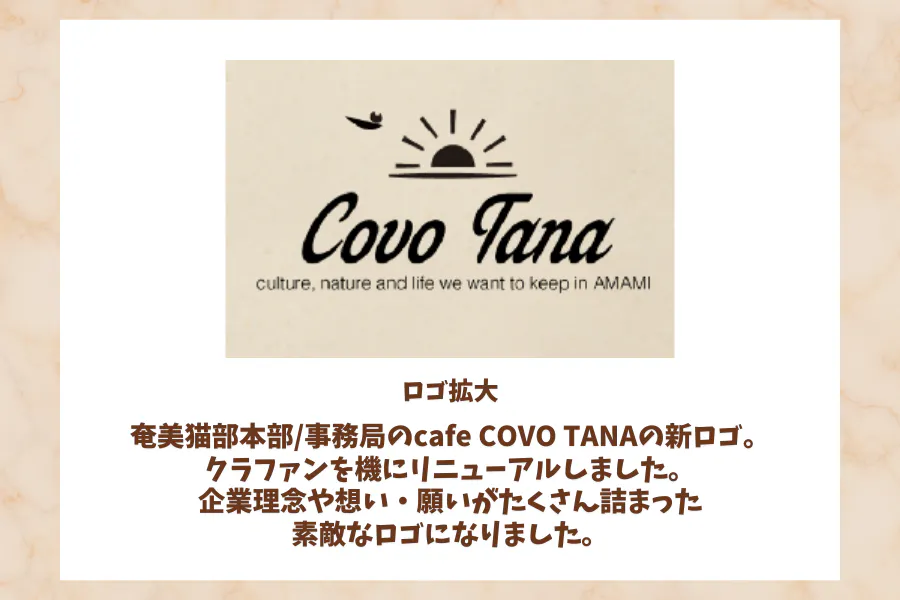 日本中・世界中でネコ問題が溢れている昨今。やっと、室内飼育や避妊去勢も常識になり、殺処分数の減少や屋外で病気や事故で亡くなる猫も減ってきていますが、これまでとてつもない数の猫の命が、奄美に限らず世界中で失われてきました。まだ現在も犠牲はまだまだ途絶えません。その犠牲を無駄にしないための象徴として、昔からCOVO TANAのロゴにはひっそり猫を忍ばせています。