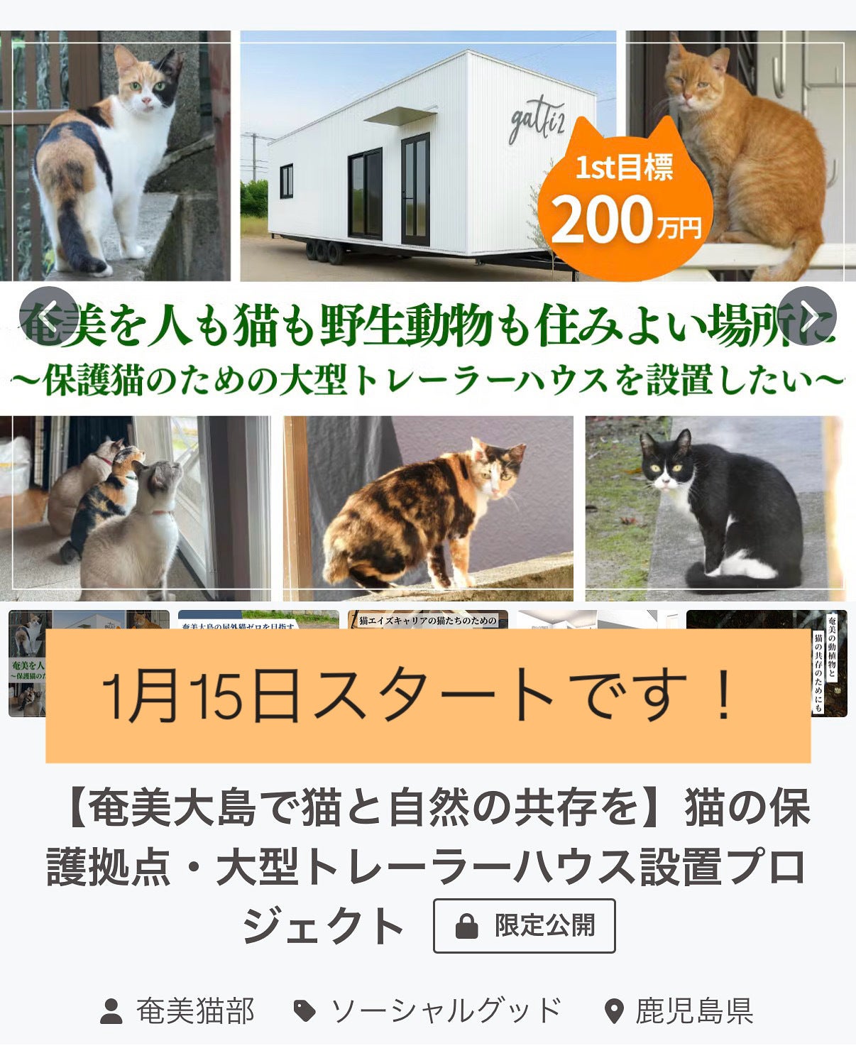 2026/01/01 12:28新年あけましておめでとうございます。奄美猫部代表 久野です。昨年初挑戦したクラウドファンディングでは、たくさんの応援をいただき、誠にありがとうございました。おかげで、こうして無事新しい年を迎えることができ、計画は少しずつ前に進んでおります。改めまして心より感謝申し上げます。ただ、まだ目標としている金額には届いておらず、前回から間が空いていない中ではございますが、第2回目のクラウドファンディングに挑戦させていただくことになりました。ー第2弾クラファン挑戦のお知らせー猫エイズキャリアの猫たちが、安心して暮らせるトレーラーハウス設置を目指した、クラウドファンディング。**1月15日**よりスタート予定です。人も猫も野生動物も住み良い奄美大島へ!そんな変わらぬ想いで走っている奄美猫部です。猫と自然環境との共存を目指すこの島で、再び挑戦です。リターンには、前回のご支援で実現したオリジナルグッズから数点ご用意しています。公開まで、どうぞ楽しみにお待ちください。また、事前お気に入り登録数が多いと、CAMPFIREページでオススメしていただける機会が増えるとのこと。ぜひお気に入り事前登録のご協力を、どうぞよろしくお願いいたします。※公開前ページ、お気に入り登録は、以下のリンクからご確認いただけます。クラファン第2弾2026年も、奄美大島のネコ問題を通して、ペットとその福祉、人と自然環境、そして防災にと、精一杯取り組んでまいります。本当に課題が多く、皆様からのご理解や応援がないとくじけてしまうことばかりです。引き続きご理解ご協力をよろしくお願いいたします。奄美猫部/COVO TANA スタッフ一同 もっと見る