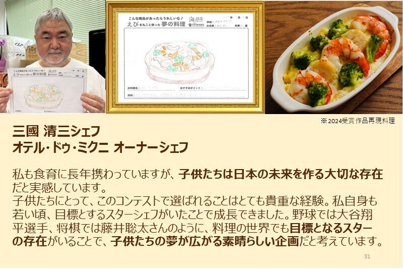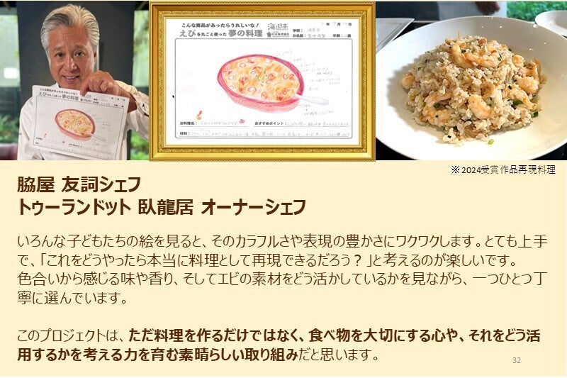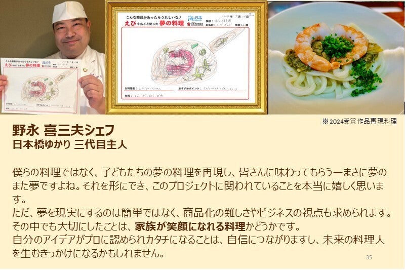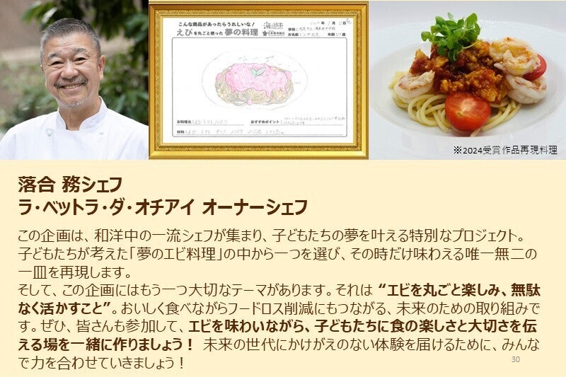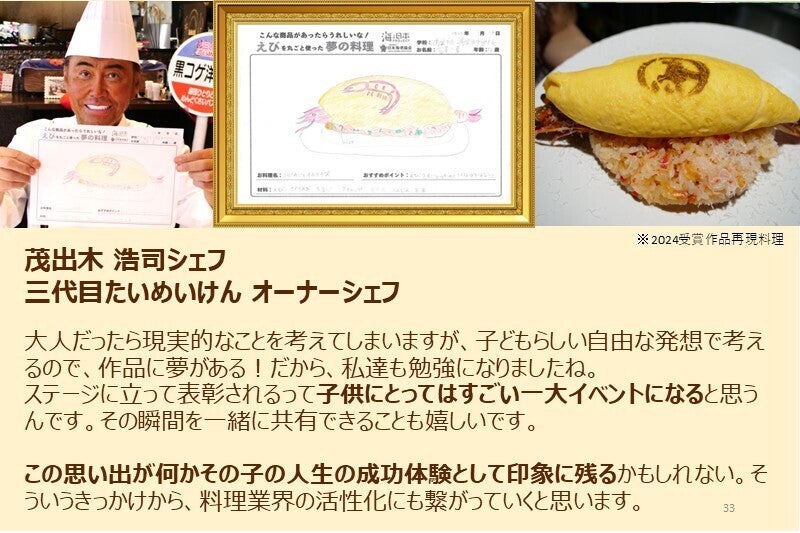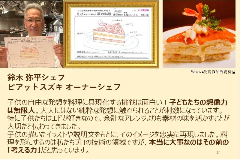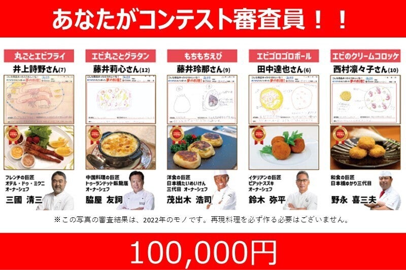 「えび丸ごと夢の料理コンテスト」は、ただ夢のエビ料理を描くだけではありません。「シェフ部門」を受賞した作品は、テレビでも紹介される一流レストランのシェフが実際に再現し、まるで本物の料理として生まれ変わります。。