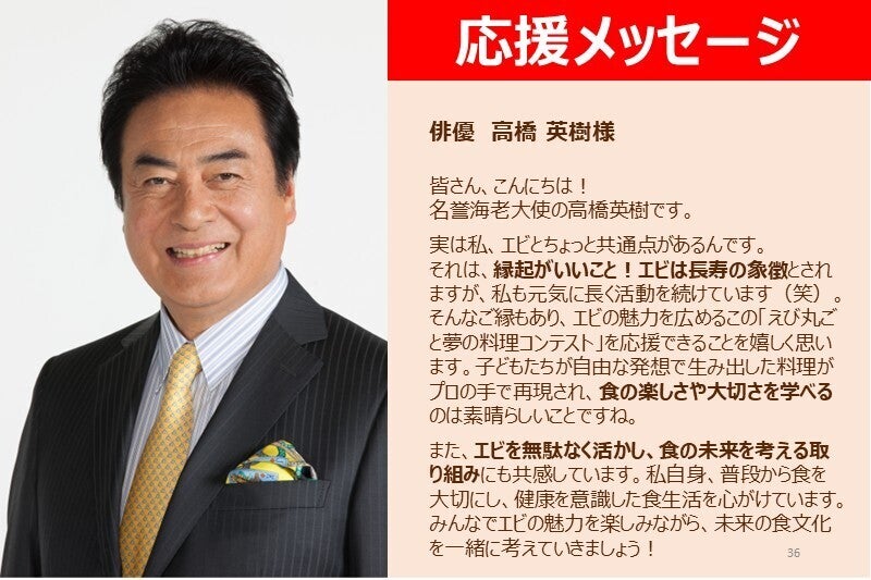 「えび丸ごと夢の料理コンテスト」は、一流レストランのシェフや有名企業などに審査員の方々が審査員を務めています。今年はさらに、日本海老協会が認定する「名誉海老大使」にも選ばれた髙橋英樹さん・真麻さん親子、そして子どもたちに大人気の音楽ユニット「ケロポンズ」も審査員として参加決定!