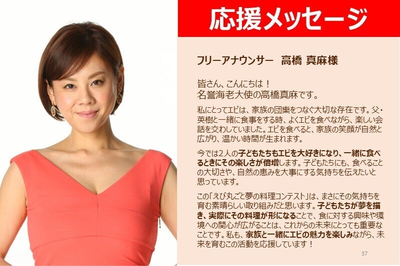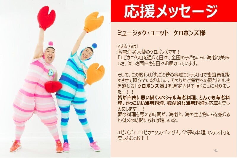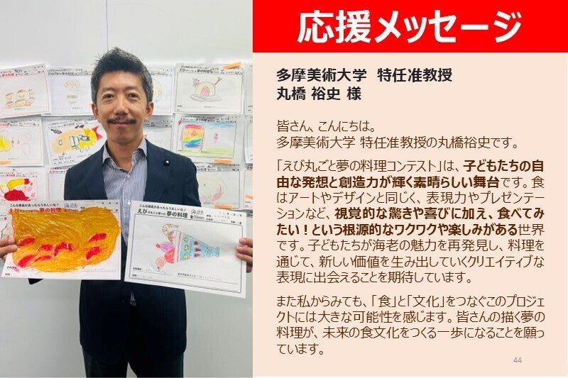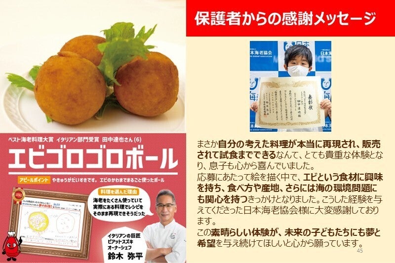 テレビやステージでおなじみのあの人たちが、子どもたちの夢のエビ料理を直接審査してくれます。自分の作品が選ばれるワクワク感とともに、コンテストをお楽しみください!