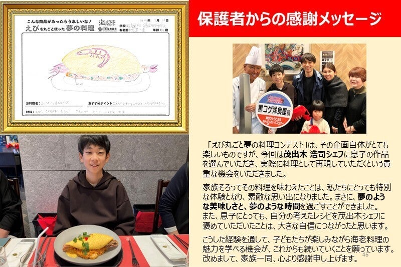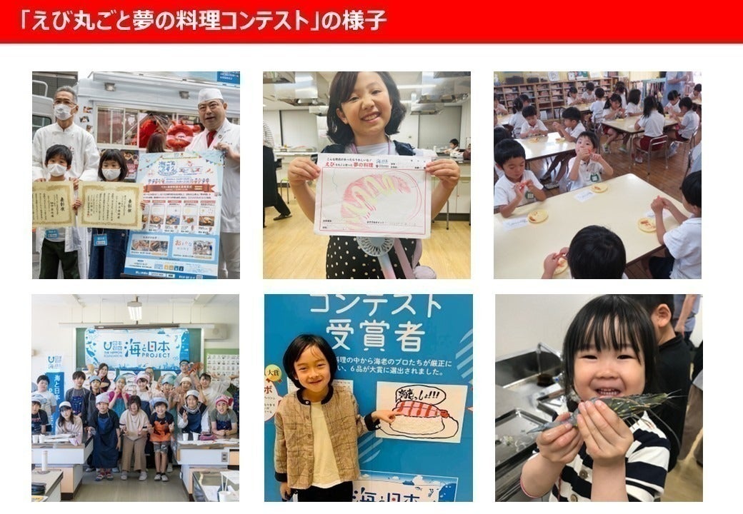 全国の小中学校、保育園・幼稚園、児童養護施設、子ども食堂などに呼びかけ、食育活動を実施。子どもたちが実際にエビを解剖し、その生態や食材としての価値を学ぶことで、「食べ物は命である」という意識を育みます。さらに、家族が笑顔になる「えび丸ごと夢の料理」を自由な発想で表現し、審査・再現・販売を通じて、食の大切さや持続可能な食文化への理解を深めることを目的としています。