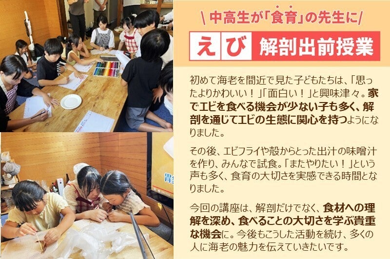 これまで、海老の美味しさを広めるイベント「エビフェス!」開催のほか、子どもたちに向けた「えび解剖教室」を企画して小学校に出向くなど、地道な食育活動もしてきました。