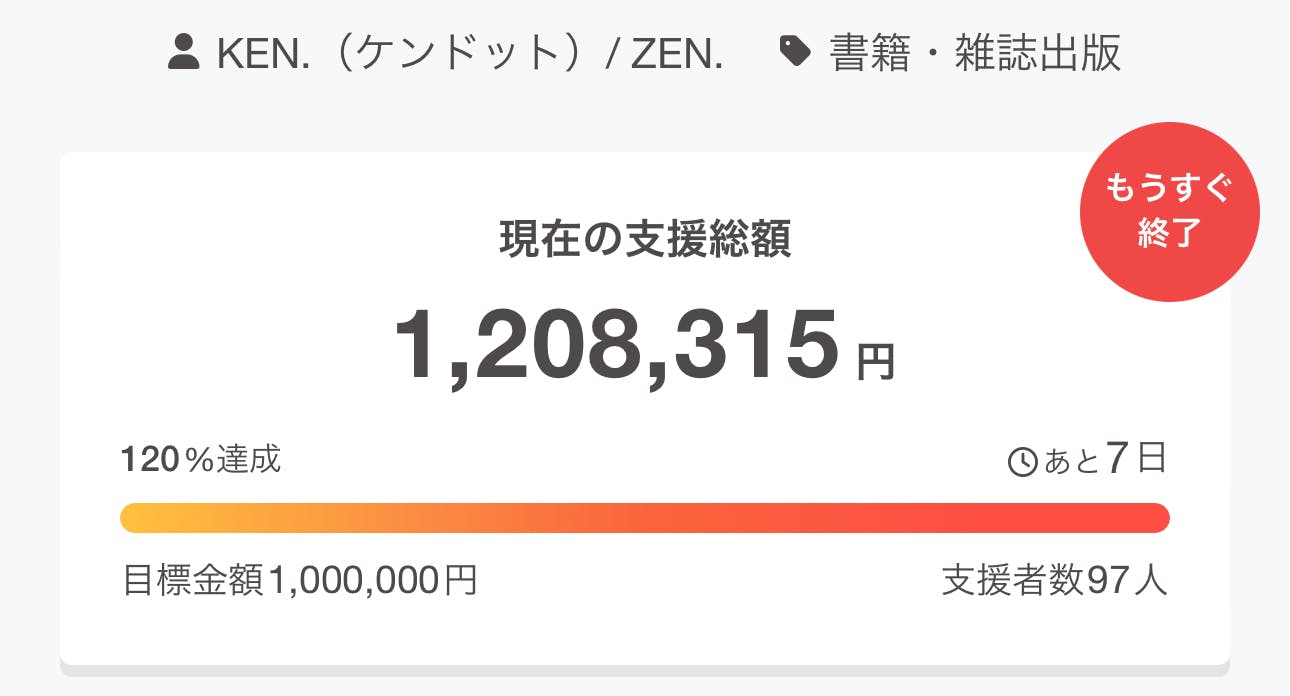 支援総額は1,208,315円(120%)、支援者数は97名に到達。
