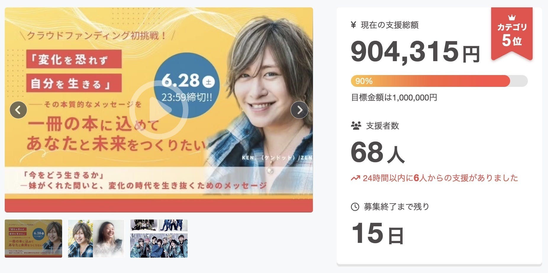 クラファンもいよいよラスト10日に突入。支援総額は現在1,083,315円(108%達成)/支援者数89名となりました!たくさんのご支援、本当にありがとうございます。そしてついに…セカンドゴールに向けて正式に走り出しました。目標は 150%‼︎次なるステージでは、「本をより多くの人に届けること」そして「妹・ANNAの声を音楽として未来へ紡ぐこと」に挑戦します。本当に大切なフェーズです。ここからもどうか、力を貸してください。そんな中、昨日はとある**“ちょっとした同窓会みたいなフェス”**に参加してきました。主催は、僕がかつてプロデュース・創設したメンズグループ「BUZZ-ER.」の元メンバーが社長を務める会社。そしてそのイベントには、僕の最後のプロデュースグループ「SE7ENTH SENSE」も出演していました。やつらなかなかいいライブしてました!笑いやしかしもうね、知り合いだらけで終始喋りっぱなし。笑でもその中でふと感じたのは、“僕が育てた子たちが、今はさらに“下の世代”をプロデュースしている”という現実。それってまるで…孫を見る親戚の気分。笑我が子をみるお父さんも撮影しといた!笑(このフェスでデビューの新グループです!)直接の関係はなくても、確かに波紋のように広がっていく“繋がり”があって、その最初の一滴を落とした自分を、今日はちょっとだけ褒めてやろうと思いました。そんなエモい気持ちを味わえた昨日の夜。写真は“家族みたいな存在たち”と!(みんな、ほんとよく頑張ってた。ありがとう!)セカンドゴールへ。ここからも、まだまだ広げていきます。KEN. / ZEN.あ、最後に円陣!笑