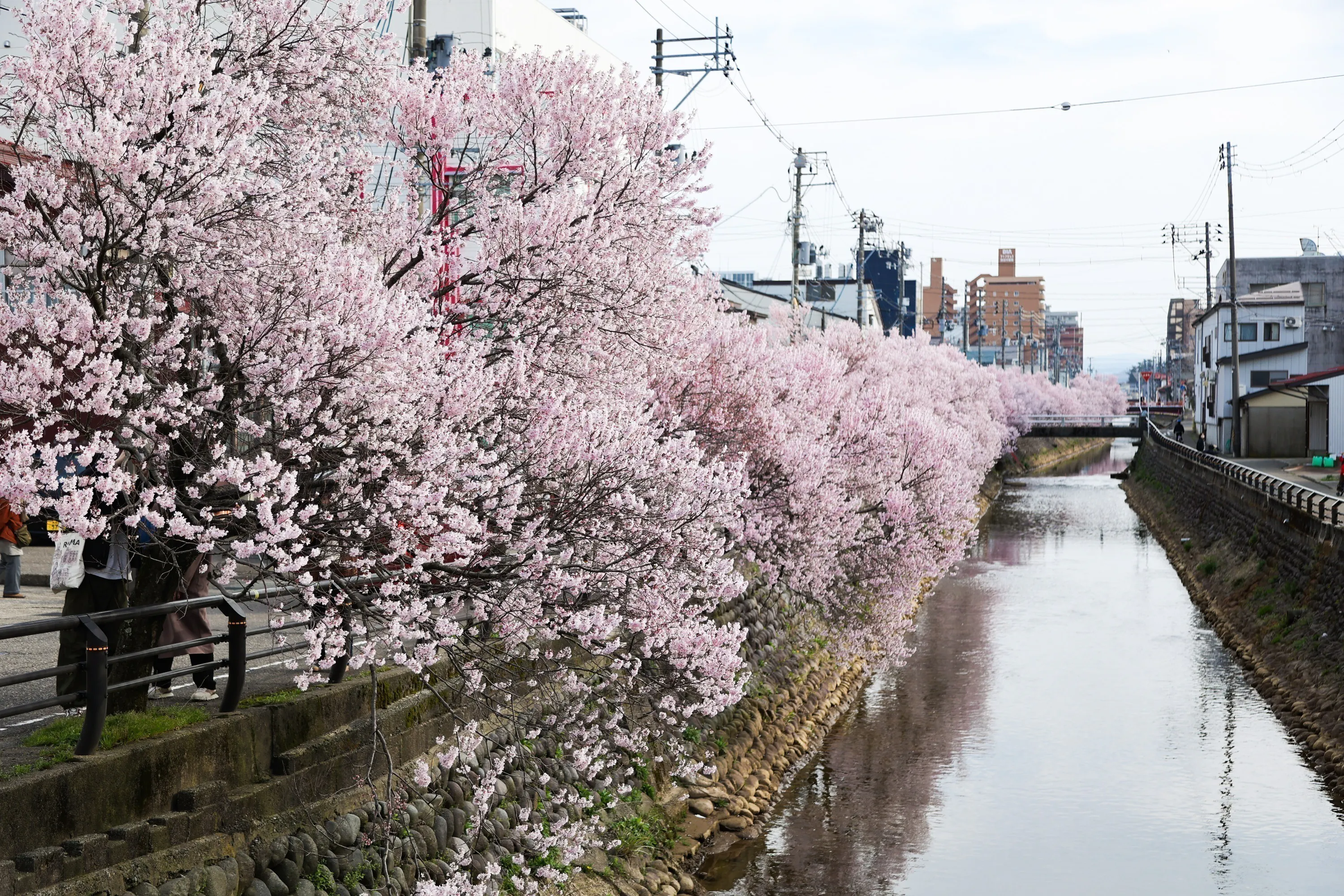 高田城址公園はえちごトキめき鉄道「高田駅」を降りて高田本町345商店街を通り、徒歩18分のところにあります。高田本町商店街の近くには儀明川が流れており、川沿いには小彼岸桜並木があります。小彼岸桜の開花は公園内のソメイヨシノよりも約10日ほど早く、公園の桜が開花する前の隠れたお花見スポットとして地元の人に愛されております。