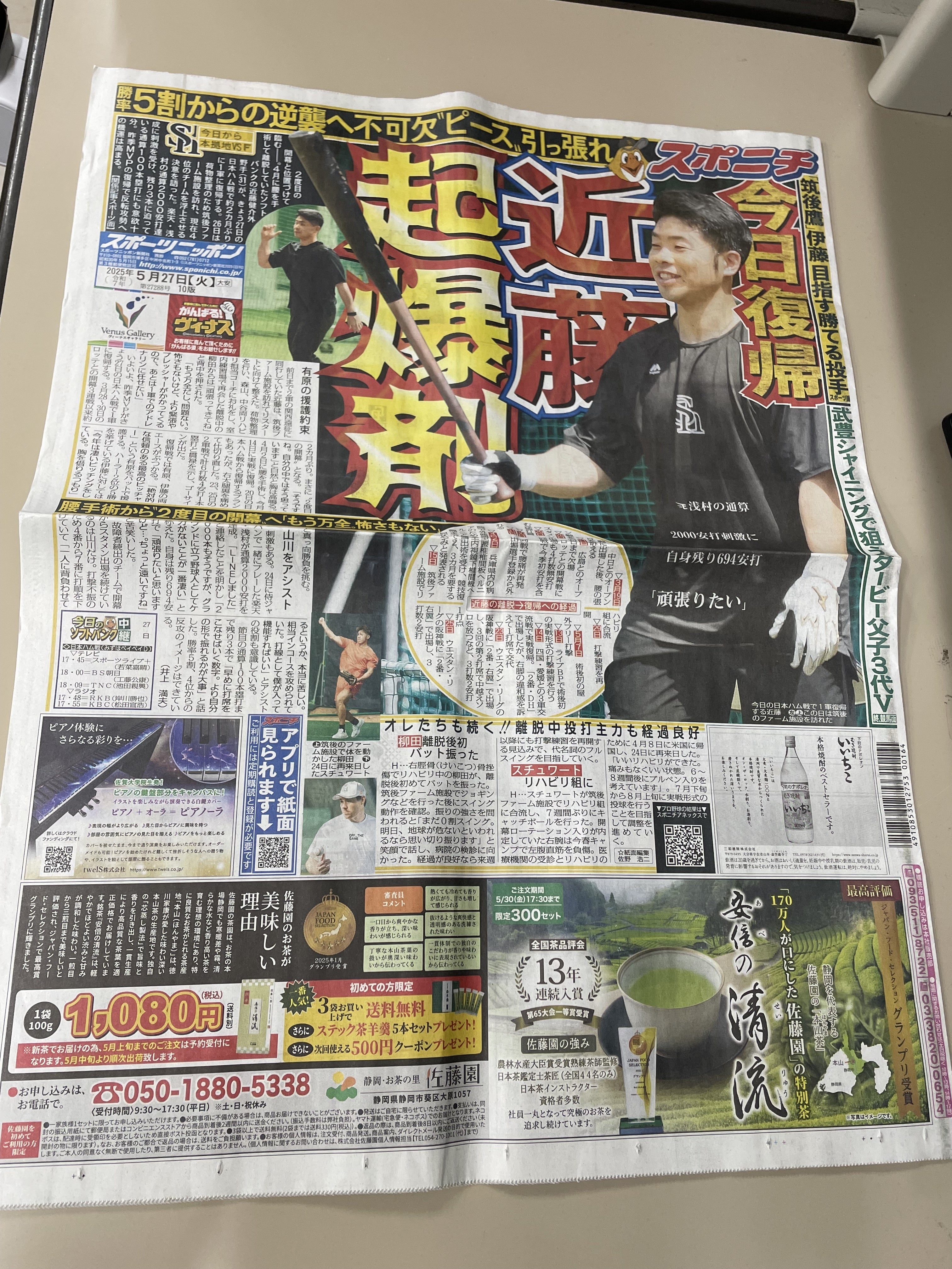 本日5/27(火)発行のスポーツニッポン新聞(西部本社版)の1面左下に弊社の新商品であるピアノのイラスト鍵盤カバー「ピアノーラ」をカラーでご紹介いただきました。