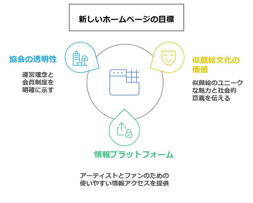 そのためには、透明性の高い情報提供や、見やすく使いやすいデザインのホームページが必要です。今回のプロジェクトの動機は、このような課題を解決し、協会の活動をより多くの人に知ってもらい、似顔絵文化をさらに広めていくための基盤を築くことにあります。