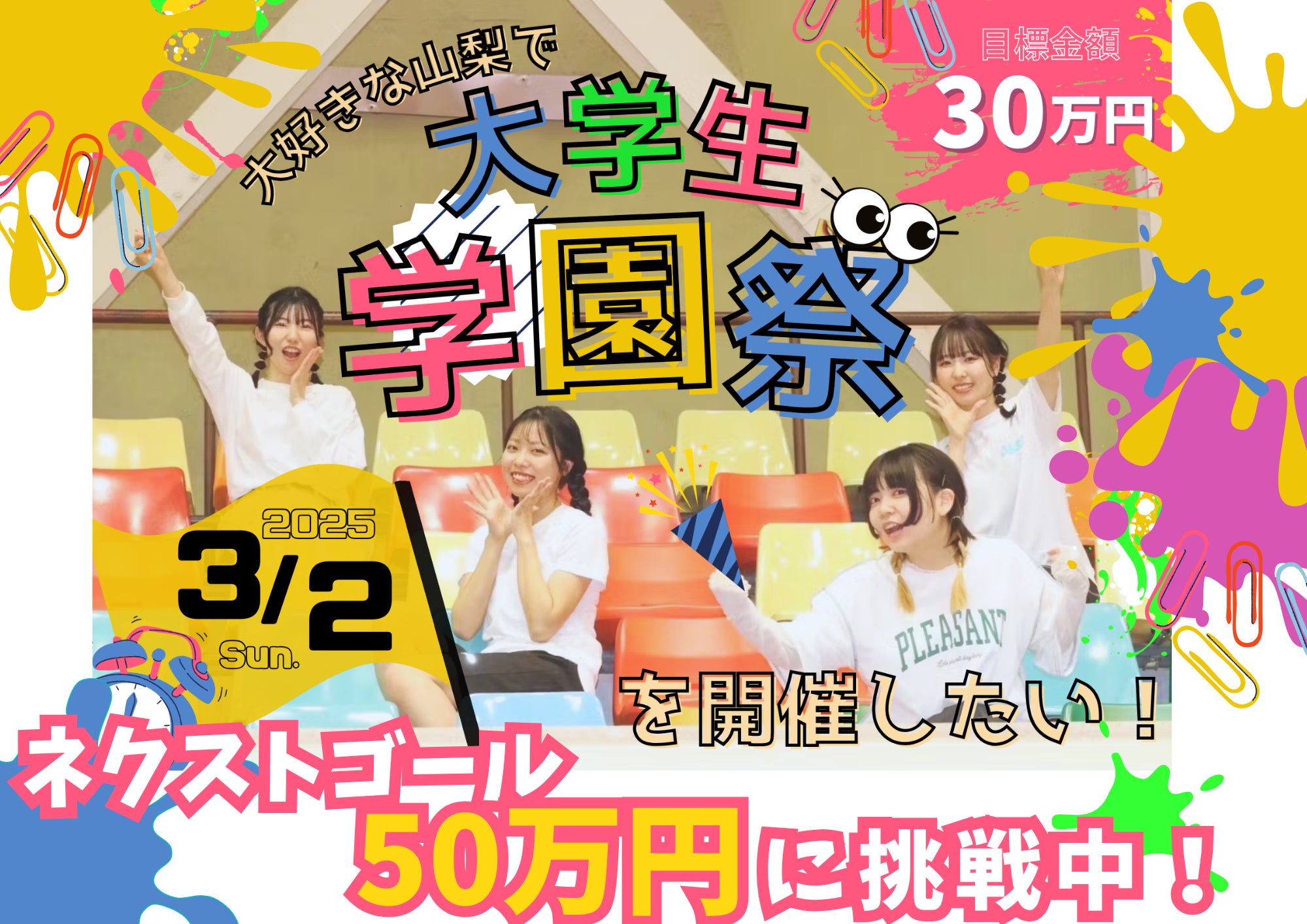ついに!目標金額である30万円を達成しました~!みなさまの応援のおかげです。応援してくださった方々、本当にありがとうございます!これまで関わってきた方からの応援をたくさんいただいて、運営メンバーもみんな、嬉しい気持ちでいっぱいです。しかしここだけのお話ですが、開催資金、まだ足りていないんです…「当日出店してくれる中学生たちにはクラスTシャツをプレゼントしたいな」「当日もっとワクワクを提供するために、アーチを作りたい!」「学生と大人が交流出来たことを可視化できたら面白いんじゃない!?」「当日来れなかった人も楽しめる学園祭ムービーを作りたい!!」やりたいことを挙げだしたらキリがないのですが、実現のためには資金が足りません。学生も社会人も、学園祭に関わる人がみんな楽しめるイベントをつくりたい!これまでの活動を地域に還元したい!その一心で、運営メンバーは今頑張っています。ネクストゴール50万円の達成に向けて今まで以上に活動に励んでいきますので、どうか私たちの挑戦をもう少しだけ見守っていただけたらと思います。プロジェクトの拡散大歓迎です!支援者の方は、是非こちらの画像を使って私たちのプロジェクトを拡散してください!(文責:なっちゃん)