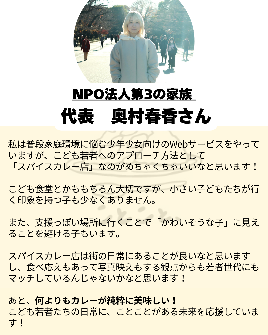 \\ 応援コメントいただいました! //NPO法人第3の家族 代表奥村春香さん奥村さんと出会ったのは「American Express inovation’s Lab U-30」でした。以前から若者支援という文脈でウォッチしていて、まさか起業家プログラムで一緒になるとは!奥村さんが代表している「第3の家族」は普段家庭環境に悩む少年少女向けのWebサービスを展開しています。HPhttps://daisan-kazoku.com/gedokunhttps://daisan-kazoku.net/gedokun私自身、学生時代しんどい時期が長く、どこかで吐き出したい!という思いがいっぱいだったのですが思うように吐き出せず、自分の内側にしまっていました。その時、公に普及しているSNSではなく「gedokun」が近くにあったら少しは楽になれたのではないかなとこのサービスを知った時に強く思いました。なぜ、このサービスを始めたのかなどのきっかけはフォーブスの記事が参考になると思いますのでぜひご覧いただければと思います。Forbes Japan 30under30 2023の記事https://forbesjapan.com/articles/detail/65699改めて、奥村さん応援コメントありがとう!これからも一緒にこども若者たちへのアプローチを色々模索していこう!!!