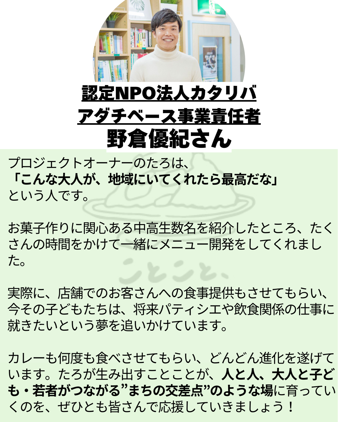 \\応援コメントいただいました!//認定NPO法人カタリバアダチベース事業責任者野倉優紀さんのぐさんこと野倉さんとは学生時代アルバイトをしていたブライダルのお仕事の現場でたまたまお会いしました。そこから「足立区・こども若者支援」という文脈でお会いすることが増え、今に至りますのぐさんは、認定NPO法人カタリバのアダチベースという足立区の中高生支援を主に行なっている事業の責任者です!アダチベース事業紹介↓https://www.katariba.or.jp/activity/project/a-base/中高生支援の文脈と絡めないか…と色々模索している中でのぐさんからの応援コメントにもありますが、高校生が間借りカレーの際にお手伝いをしたり、がっつりメニュー開発に携われるような機会を作りました。高校生の輝く姿を見て、カレー屋をより実現したい気持ちが強くなりましたね!!!一緒に、足立区盛り上げてきましょう改めて、のぐさん応援コメント、快く引き受けてくださり、ありがとうございました!これからもどうぞよろしくお願い致します。ーーーーーーーーそんな野倉さんとカレー屋の私とのイベントが3月8日(土)18時〜北千住で開催します!奮ってご参加ください!スパイスカレーを食べながら楽しく教育談義!こども若者の今と未来を語ります!詳細・お申し込みは以下のフォームから⇩https://forms.gle/E3B4SstKXE5cnnoo8