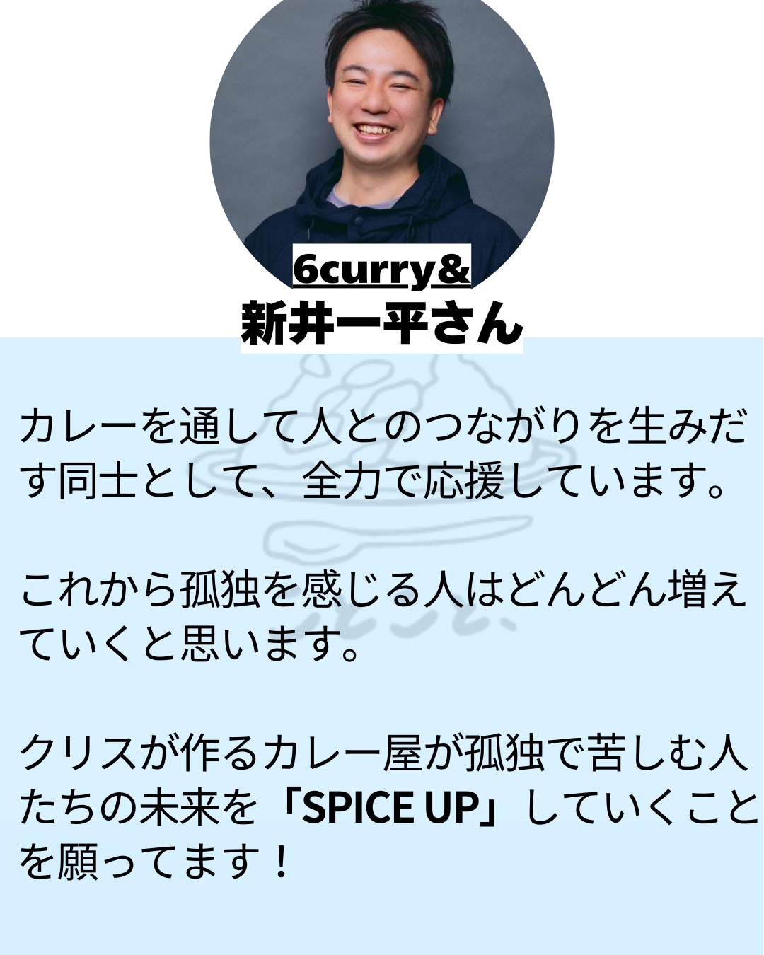 \\応援コメントいただきました//6curry& 代表新井一平さん一平さんは、学生時代のインターンしていた企業のイベントで出会いました。その時に食べた一平さんのグリーンカレーが今でも忘れられないです。そして、私がスパイスカレーを学びたい!という気持ちがでてきた時にたまたま一平さんが店主をしているカレー屋でスタッフの募集が始まり飛び込んだのを覚えています。そのカレー屋の名前は「6curry」(現 6curry &)です。現在は、静岡県三島市で活動しています。HP↓https://6curry.com/カレーで集まり、自由に広がるコミュニティ。スパイスカレーを最初に教えてくださり、スパイスカレーに関して困った時に相談に乗ってくださるカレーの師匠です。私もスパイスカレーというのをきっかけに、いろんな方の繋がりを紡いでいけたらいいなと考えています。改めて、一平さん応援コメント、快く引き受けてくださり、ありがとうございました!これからもどうぞよろしくお願い致します。6curry&インスタグラム⇩https://www.instagram.com/6curry_mishima?utm_source=ig_web_button_share_sheet&igsh=ZDNlZDc0MzIxNw==―――クラウドファンディングは、3月16日(日)23:59まで3月6日 07:51 現在支援総額:¥1,030,800支援者数:137人達成率:34%残り9日!ーーー