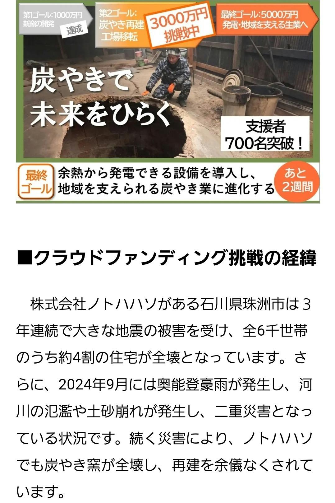 炭やきで育ててもらい、炭やきを続けて25年。これからも炭やきを続けていくには、能登にも炭やきにも、再建を越えた未来が必要です。