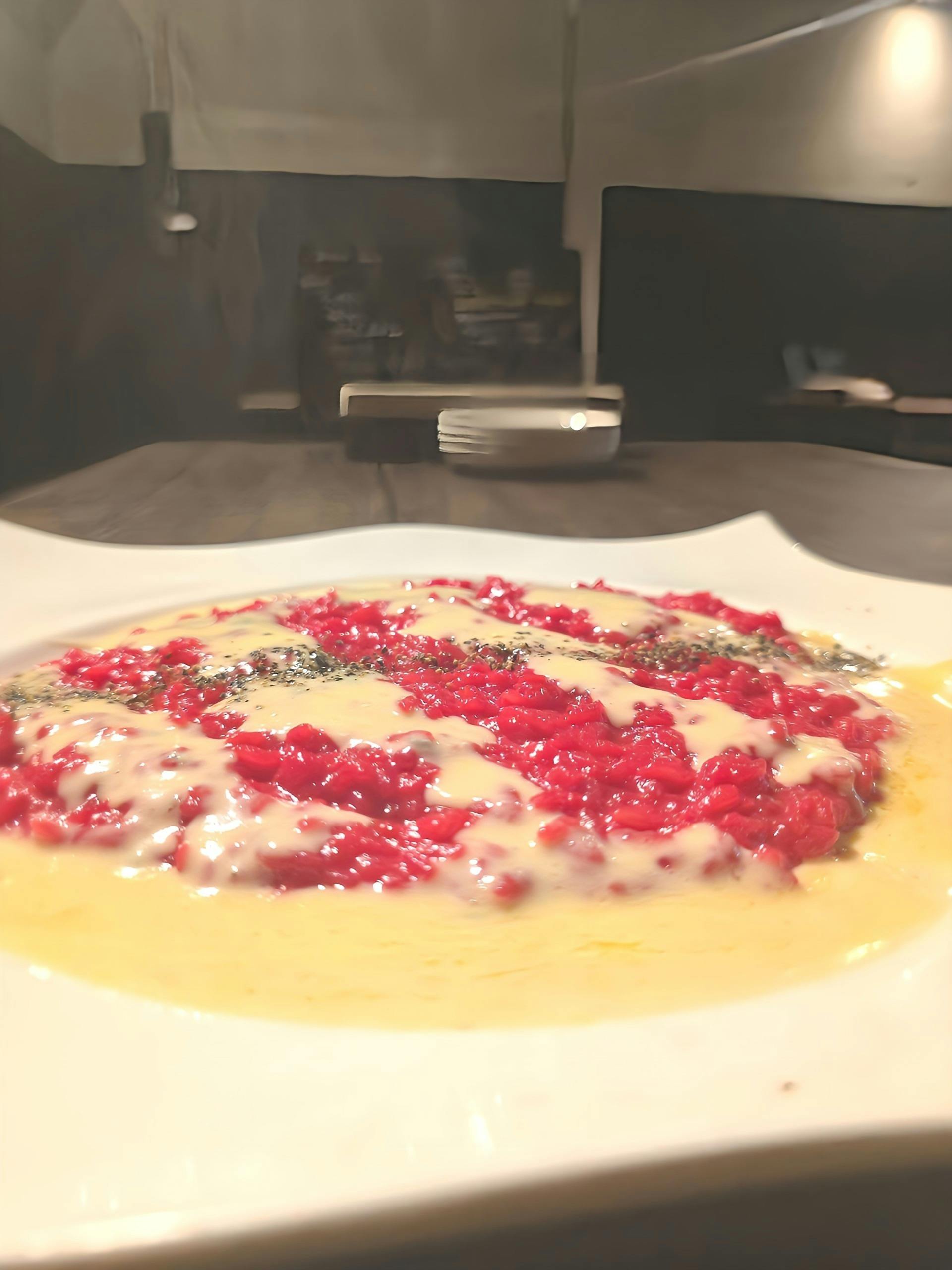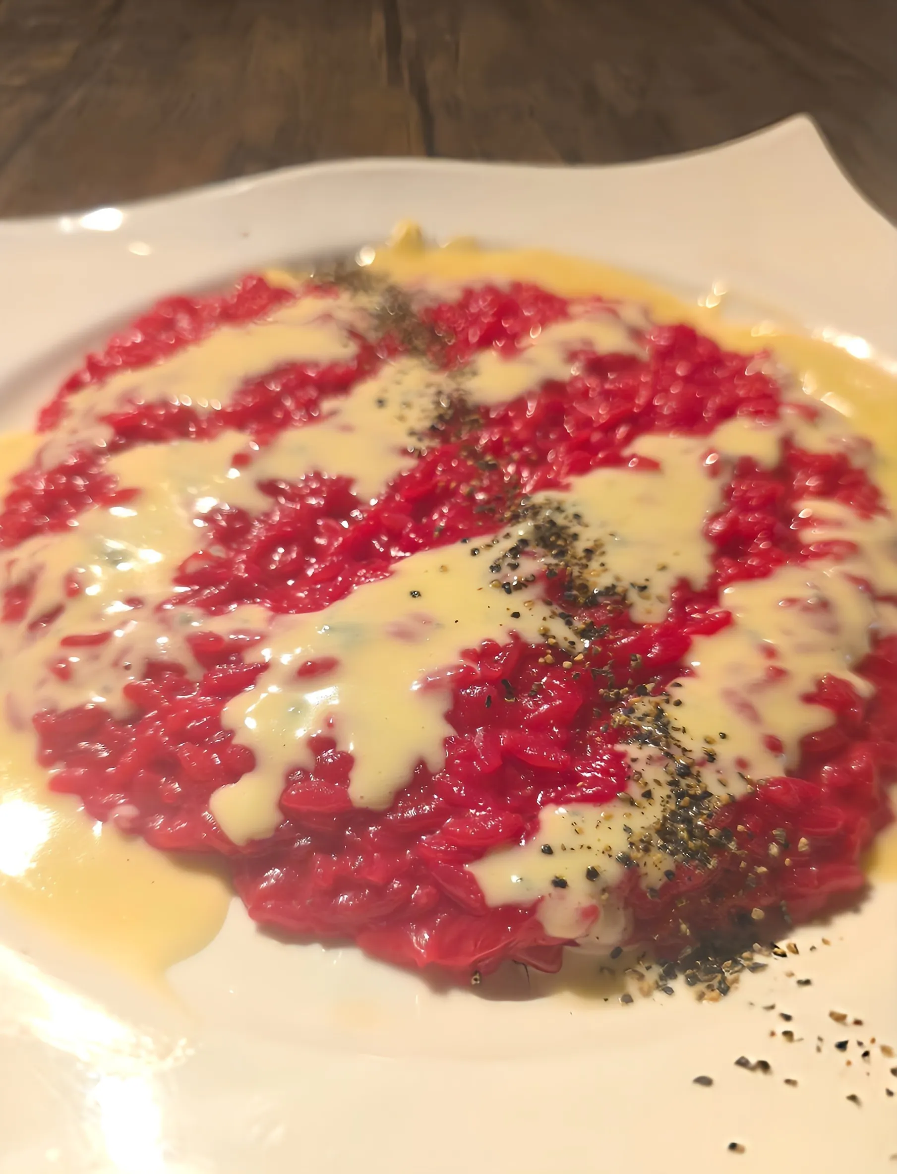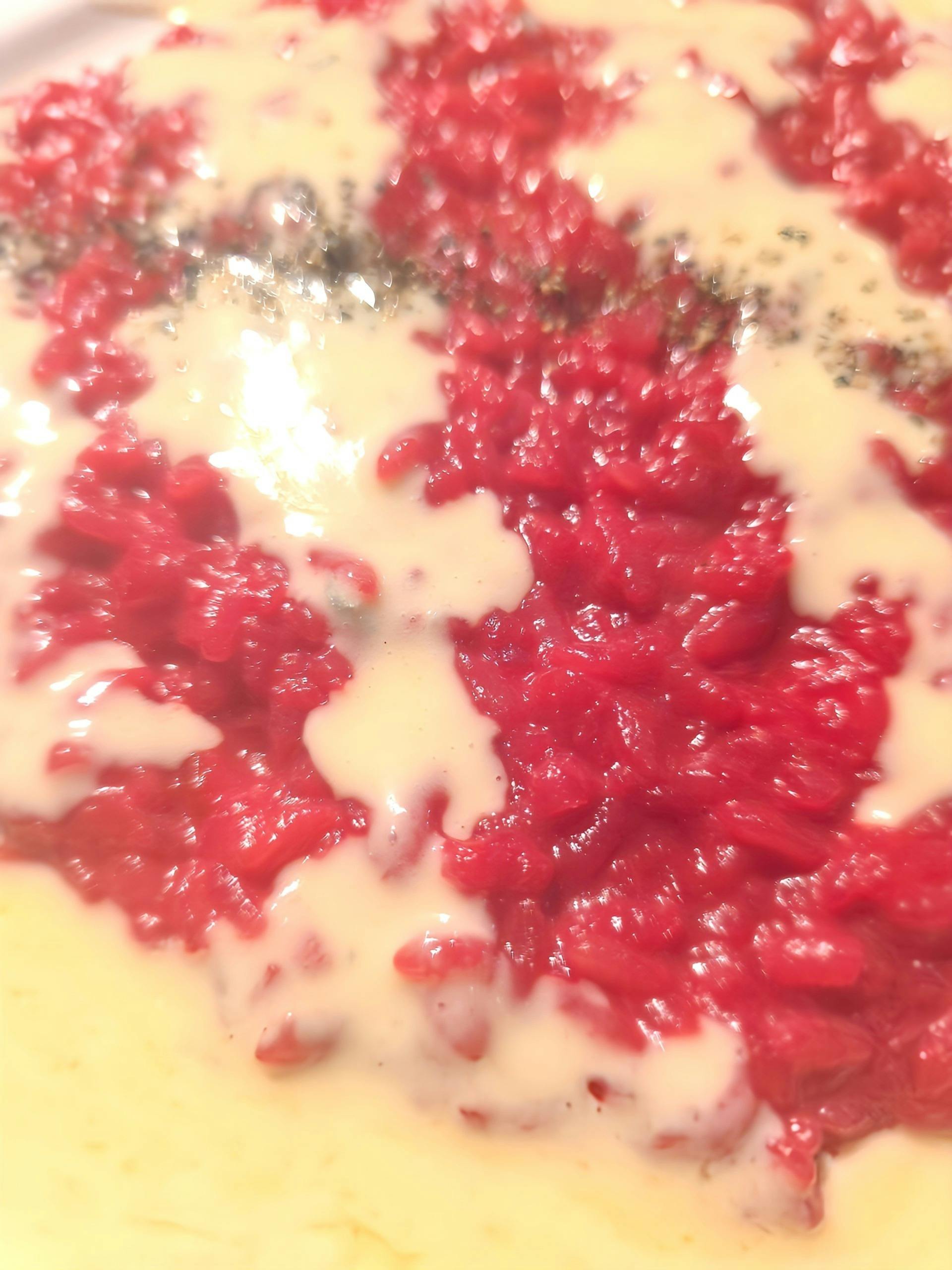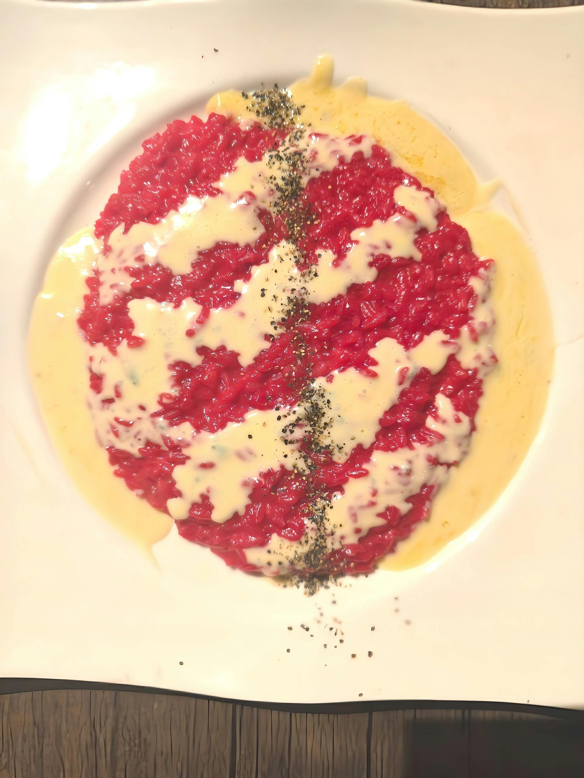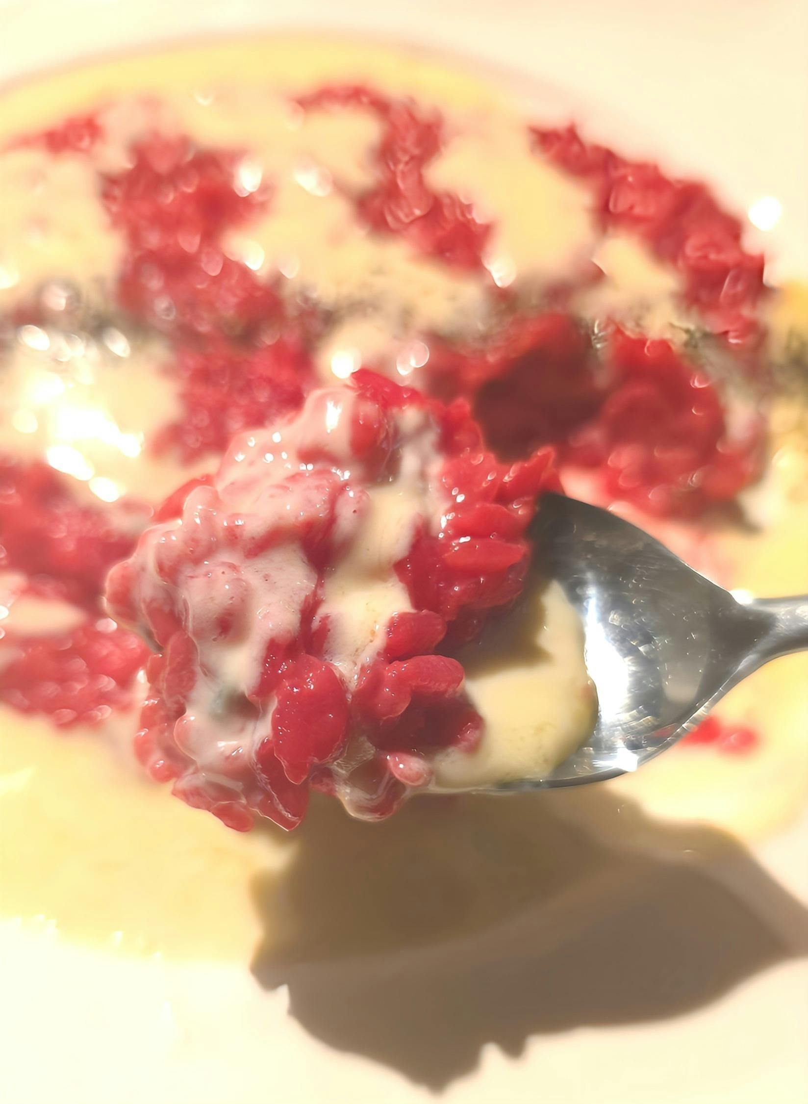 野菜と鶏肉で取ったブロードと先程の米、ビネガーを加えて柔らかく煮込んでペースとにしたビーツを加えて煮詰めていき、仕上げにバターとチーズを加えてモンテしてゴルゴンゾーラのソースかけて完成です。