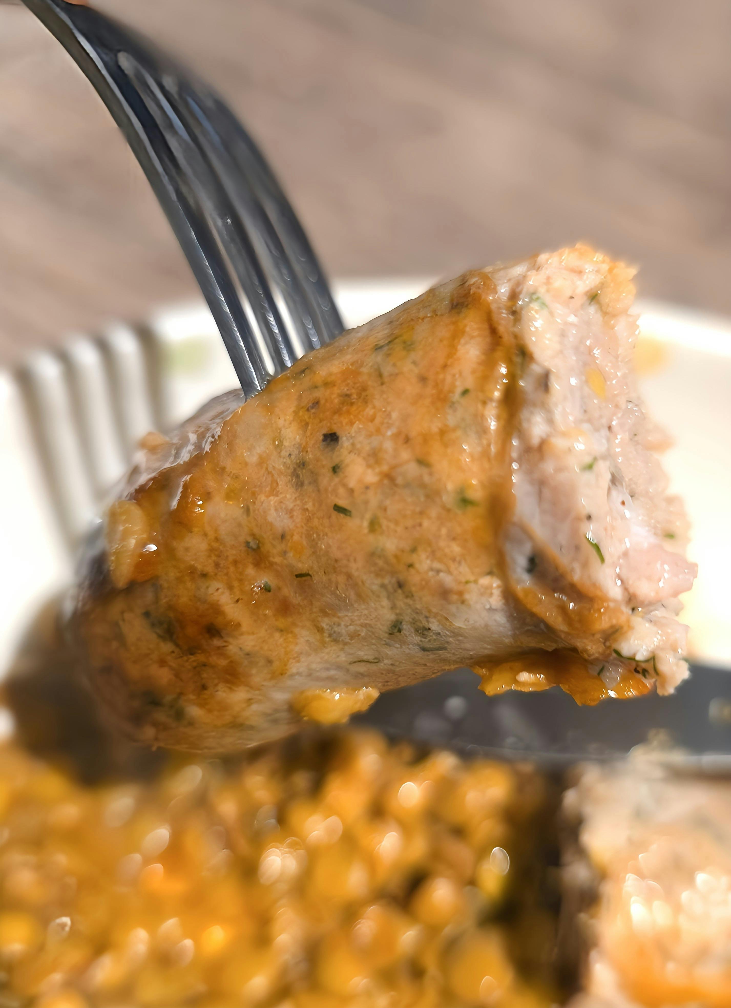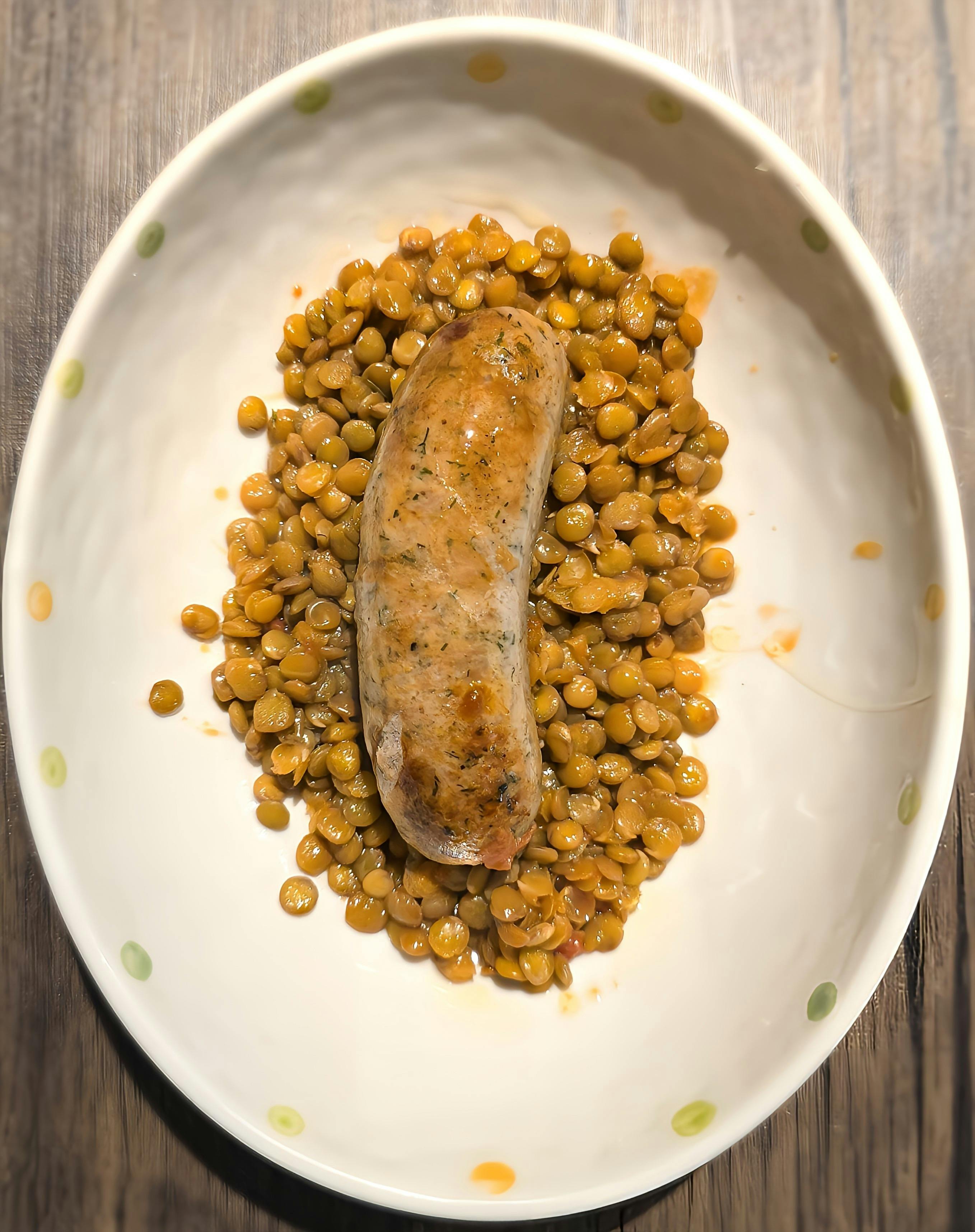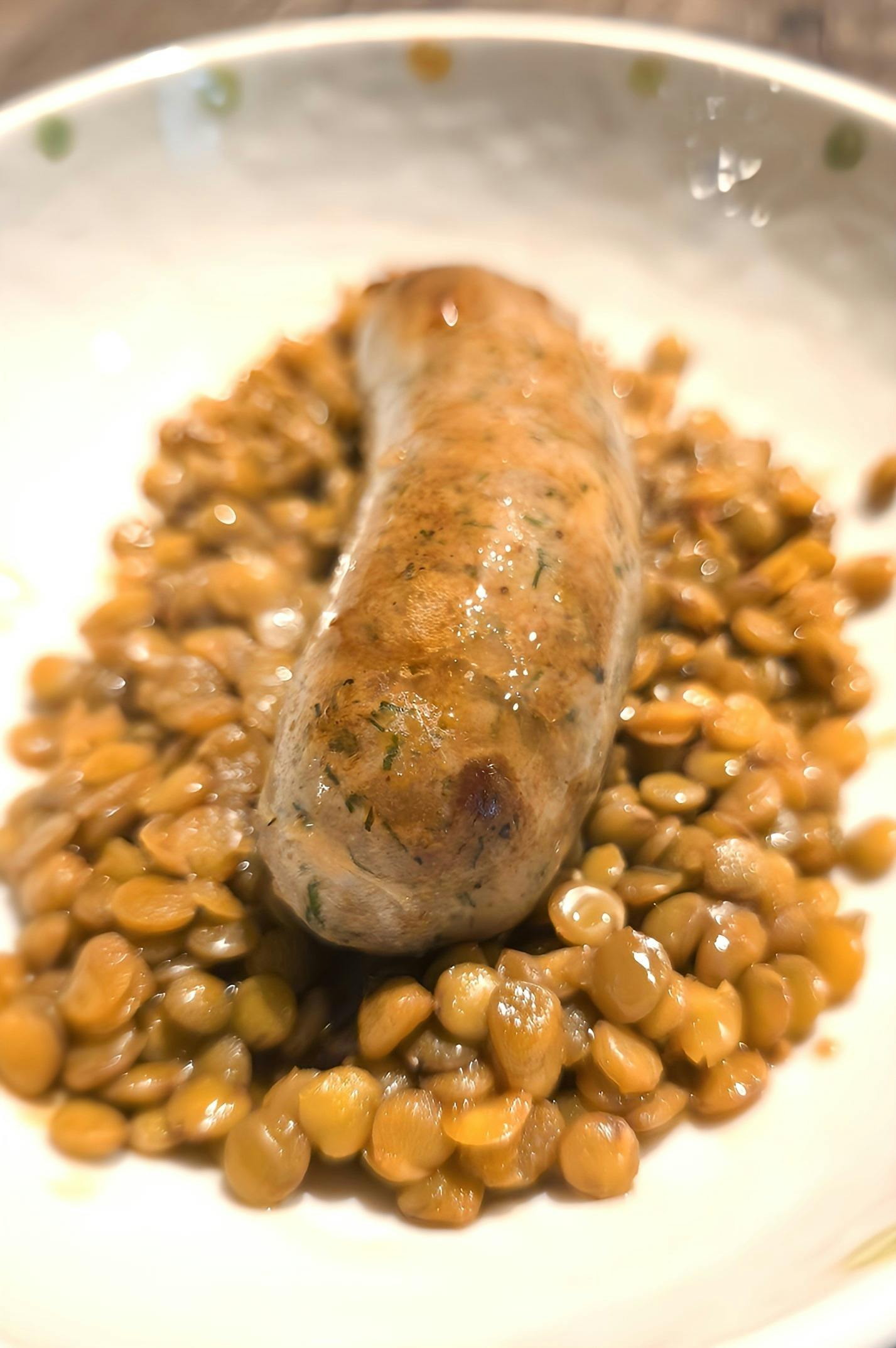 提供時にはサルシッチャを1度ボイルしてからソテーして、トマトの風味を効かせたレンズ豆と合わせて皿に盛り付けて完成です。