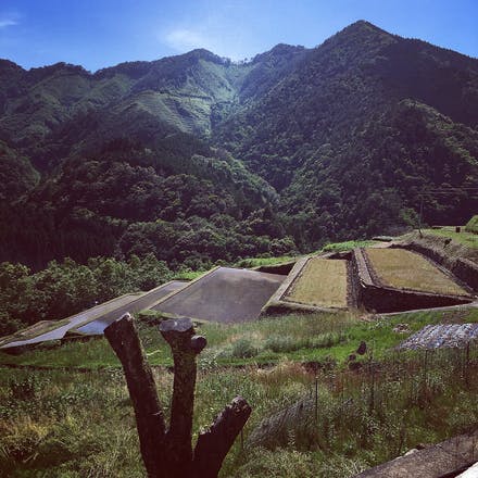 写真は廣島さんの生家のある樅木尾(もんぎゅう)今も、廣島さんのご親族がお住まいですが、日之影の役場からさらに山道を車で30分以上登りつめた場所にあります。視界が開けた先には山並み、そして急な山肌に整然と作られた棚田。ここだけではなく、日之影全体に拡がる棚田と堅牢な石組みの土台に建てられた家々の佇まいに、自然との長い格闘の末に学びとった人々の知恵の結晶を見るように思いました。