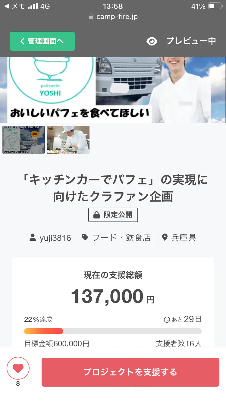 現在、16人の皆様から御支援いただき